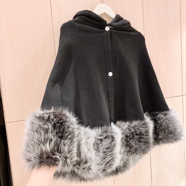 フードが付いたフェイクファーのポンチョ。 サイズを気にせずコートやお着物の上からも羽織れ、真冬でも暖かく過ごしていただけます♪ - - - 素材 コットン100%(裏起毛) 一部ポリエステル100%(ファー生地) size フリー(9号〜11号) 総丈:約63cm 桁丈:約74cm 裾幅:約91cm ※1点ものですので、多少の誤差はご了承ください color ブラック(裏起毛部分) チャコールグレー&ライトグレー(ファー部分) - - - Rina-mamaが創り出す1点ものポンチョ。 世界で1枚だけの洋服が作りたくて型紙を持たず、全て1点もので製作しています。 ◆お手入れについて 洗濯機を使って洗って頂けます。 気になられる方は、おしゃれ着用洗剤・ドライコースなどをお使いください。 ブラウス生地はお洗濯後に手で伸ばすだけのアイロン入らずのブラウスです。 気になる箇所だけ霧吹きを使って伸ばして頂く方法もあります。 お化粧が付いてしまったり、襟周りの黄ばみが気になる時は部分的にウタマロ石鹸を使って頂くと汚れが落としやすいです。