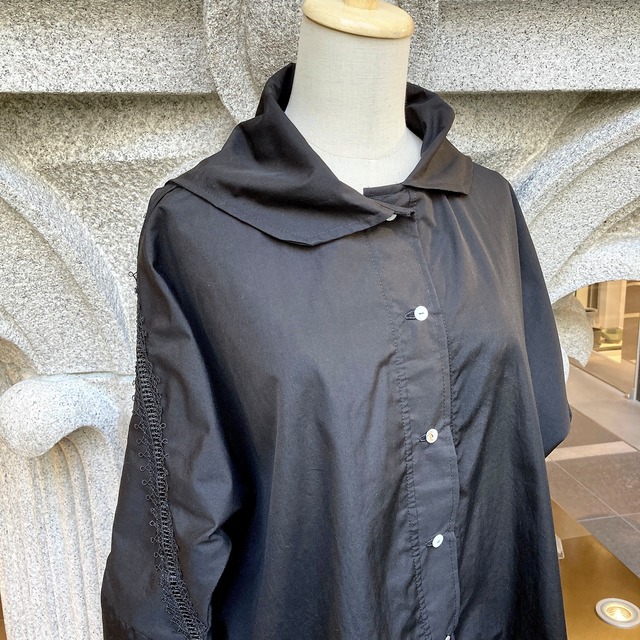 ウエストにベルトを巻くことでワンピースとして、その日の気分に合わせたコーディネートが楽しめます。 襟のデザインが目を惹き、カジュアルからフォーマルまで幅広く活躍します。 大手ブランドも使用する三度染めした漆黒の生地が、シンプルながらも高級感を演出します。 - - - 素材 コットン100%(厚手) ※透け感はありません size フリー(9号〜11号) 総丈:約95cm 桁丈:約74cm 身幅:約101cm ※1点ものですので、多少の誤差はご了承ください color ブラック - - - Rina-mamaが創り出す1点もののシロハネブラウス。 世界で1枚だけのブラウスが作りたくて型紙を持たず、全て1点もので製作しています。 ◆お手入れについて 洗濯機を使って洗って頂けます。 気になられる方は、おしゃれ着用洗剤・ドライコースなどをお使いください。 お洗濯後に手で伸ばすだけのアイロン入らずのブラウスです。 気になる箇所だけ霧吹きを使って伸ばして頂く方法もあります。 お化粧が付いてしまったり、襟周りの黄ばみが気になる時は部分的にウタマロ石鹸を使って頂くと汚れが落としやすいです。
