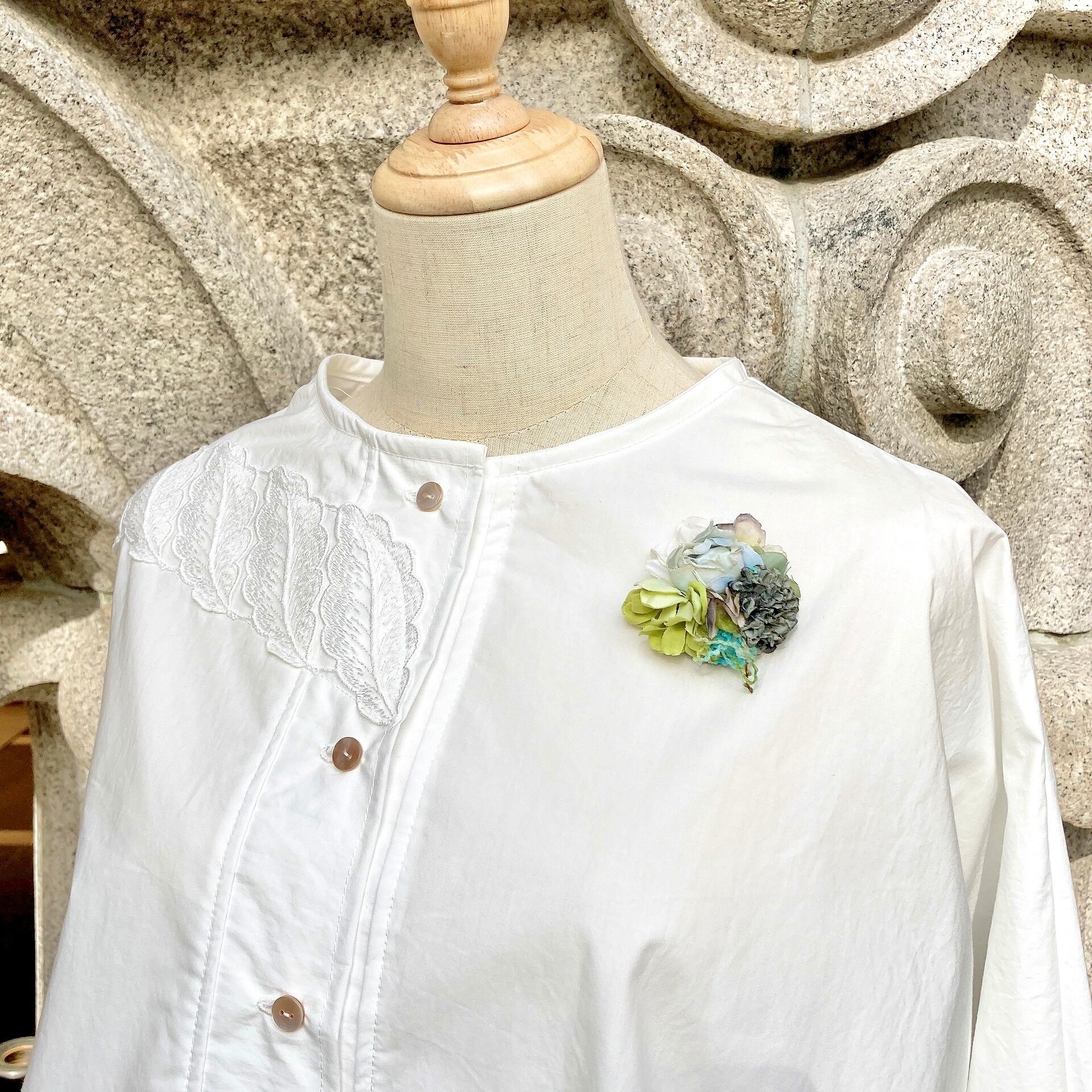 独創的な配色が特徴の大人の花アイテム。手染めのアートフラワーで作るコサージュ、ヘアアクセは全て1点もの。コサージュはマグネットで留めるので安心です。
