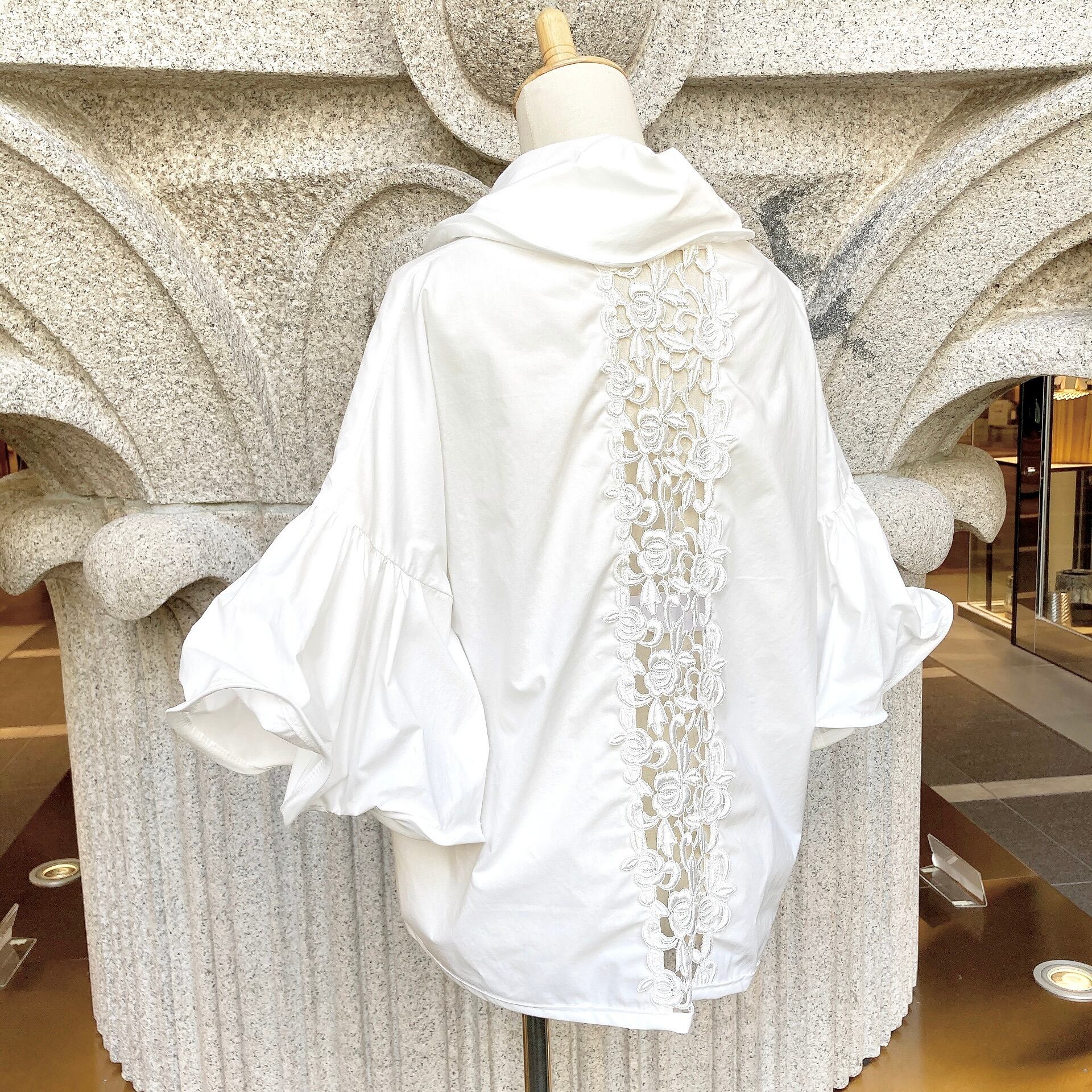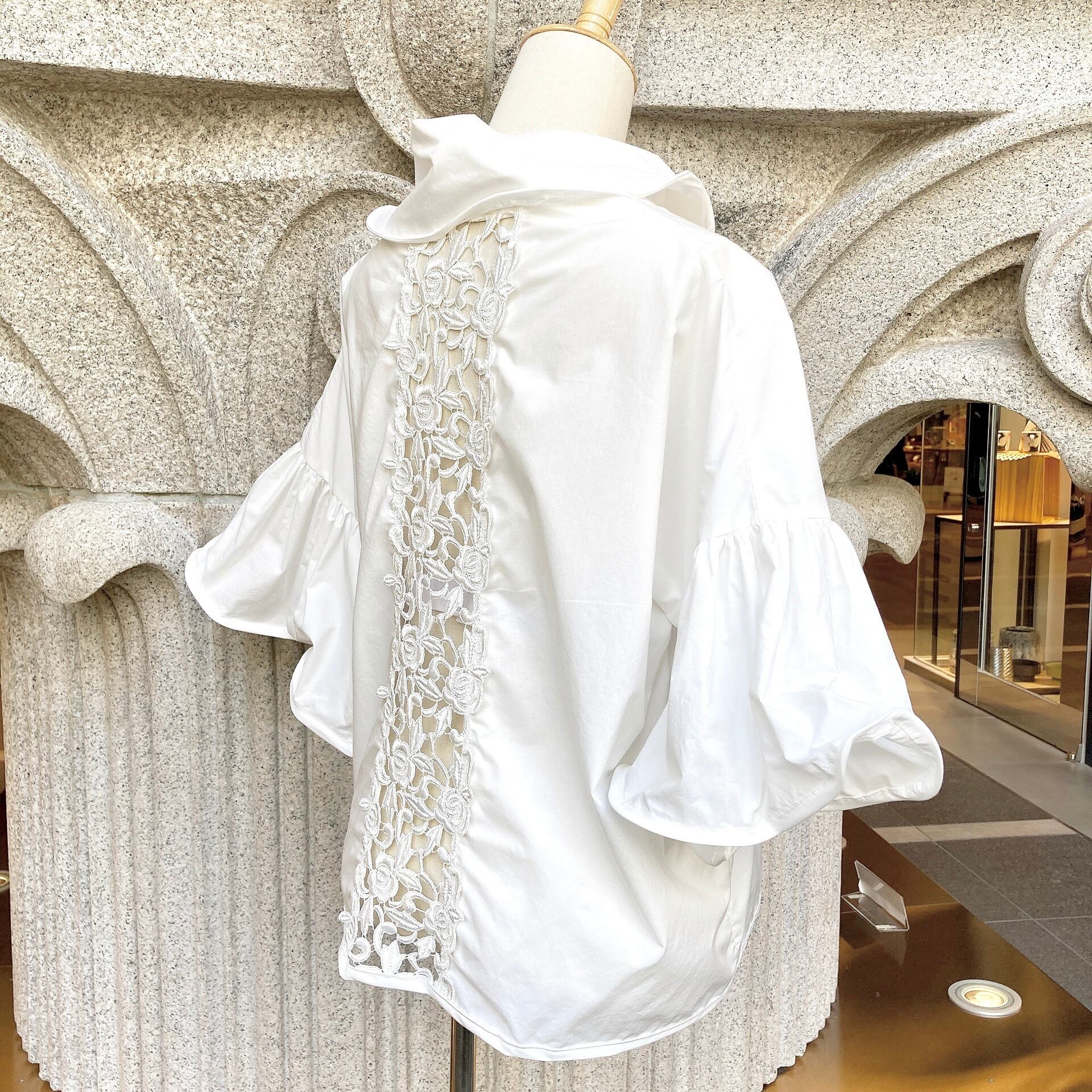 背中に美しいレースが施されたデザインと、ワイヤー入りのお袖が特徴的なブラウス。