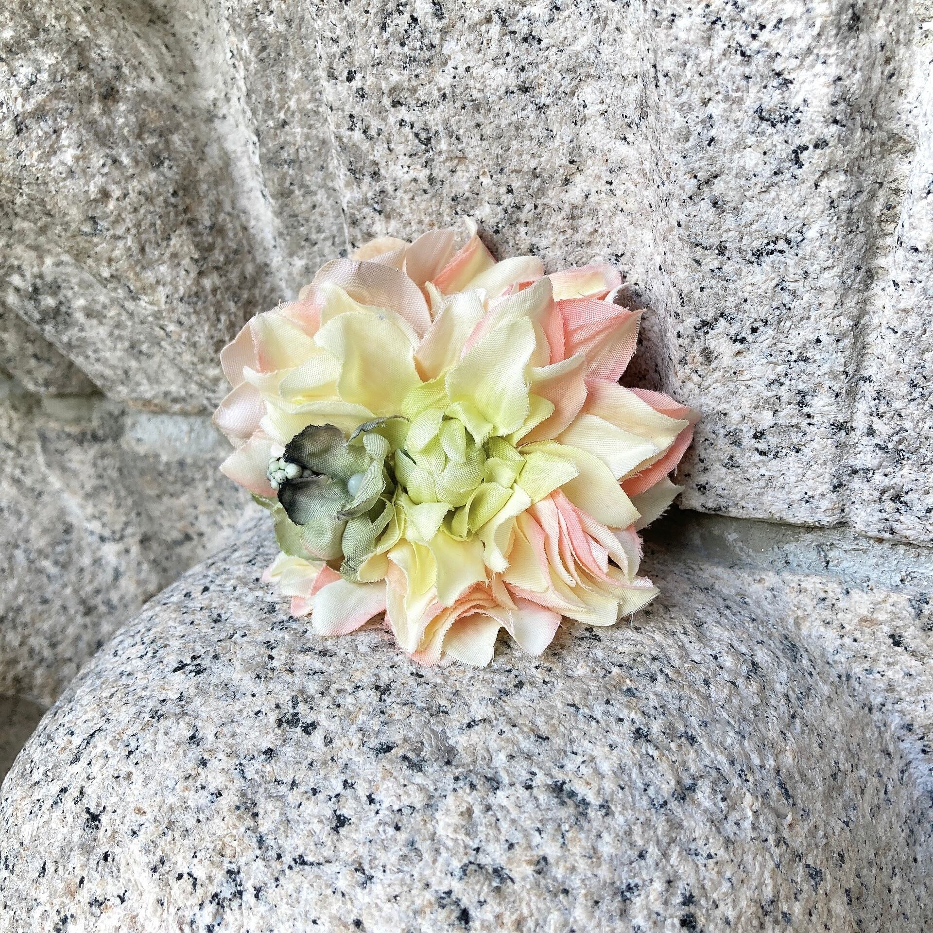 独創的な配色が特徴の大人の花アイテム。手染めのアートフラワーで作るコサージュ、ヘアアクセは全て1点もの。コサージュはマグネットで留めるので安心です。