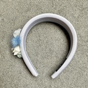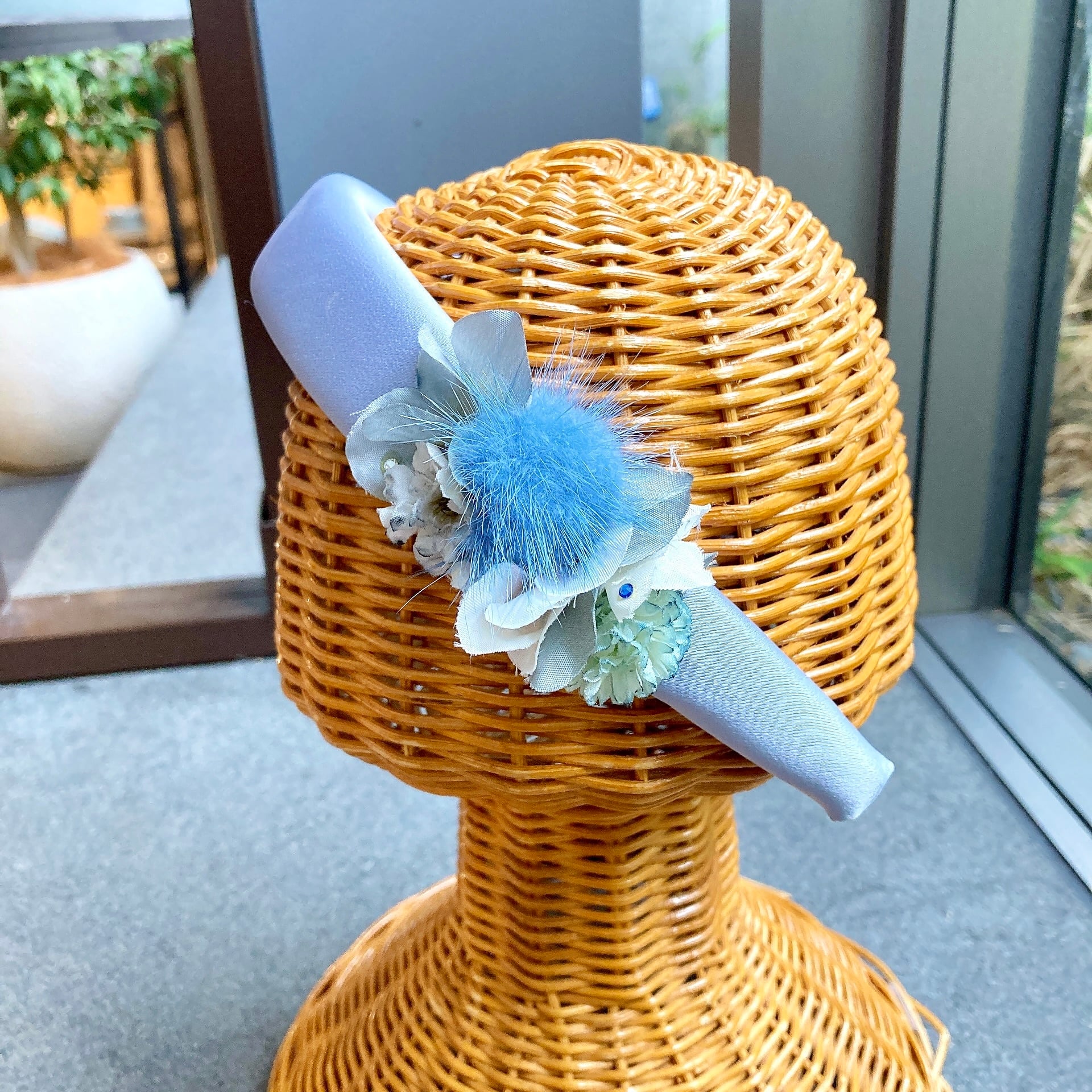 ブルーの小さなファーをアクセントにしたグレーのカチューシャ。