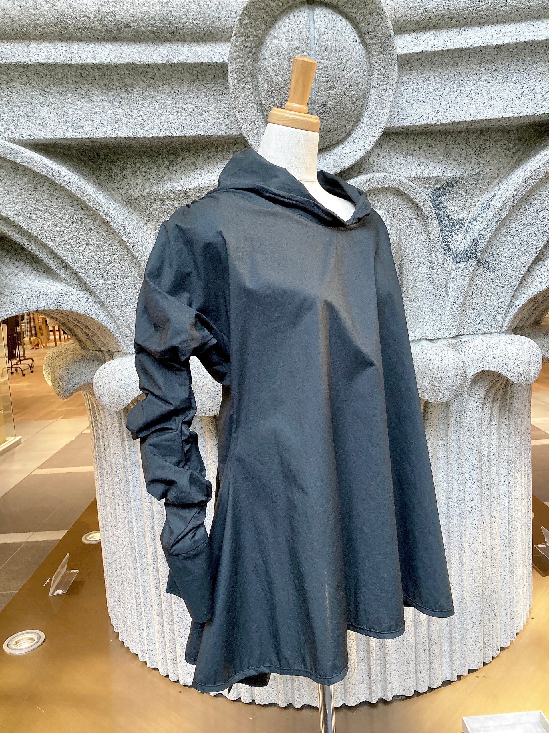 立体的なギャザーを施したボリュームスリーブと、流れるようなドレープ襟が印象的です。