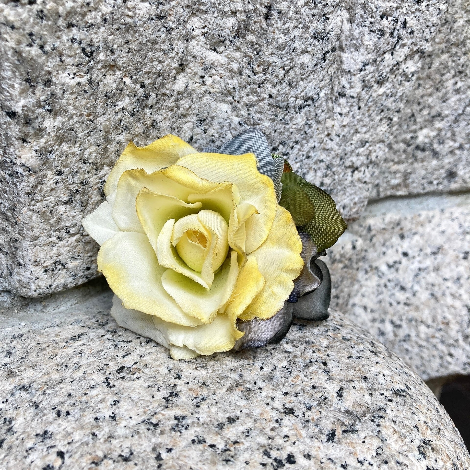 独創的な配色が特徴の大人の花アイテム。手染めのアートフラワーで作るコサージュ、ヘアアクセは全て1点もの。コサージュはマグネットで留めるので安心です。
