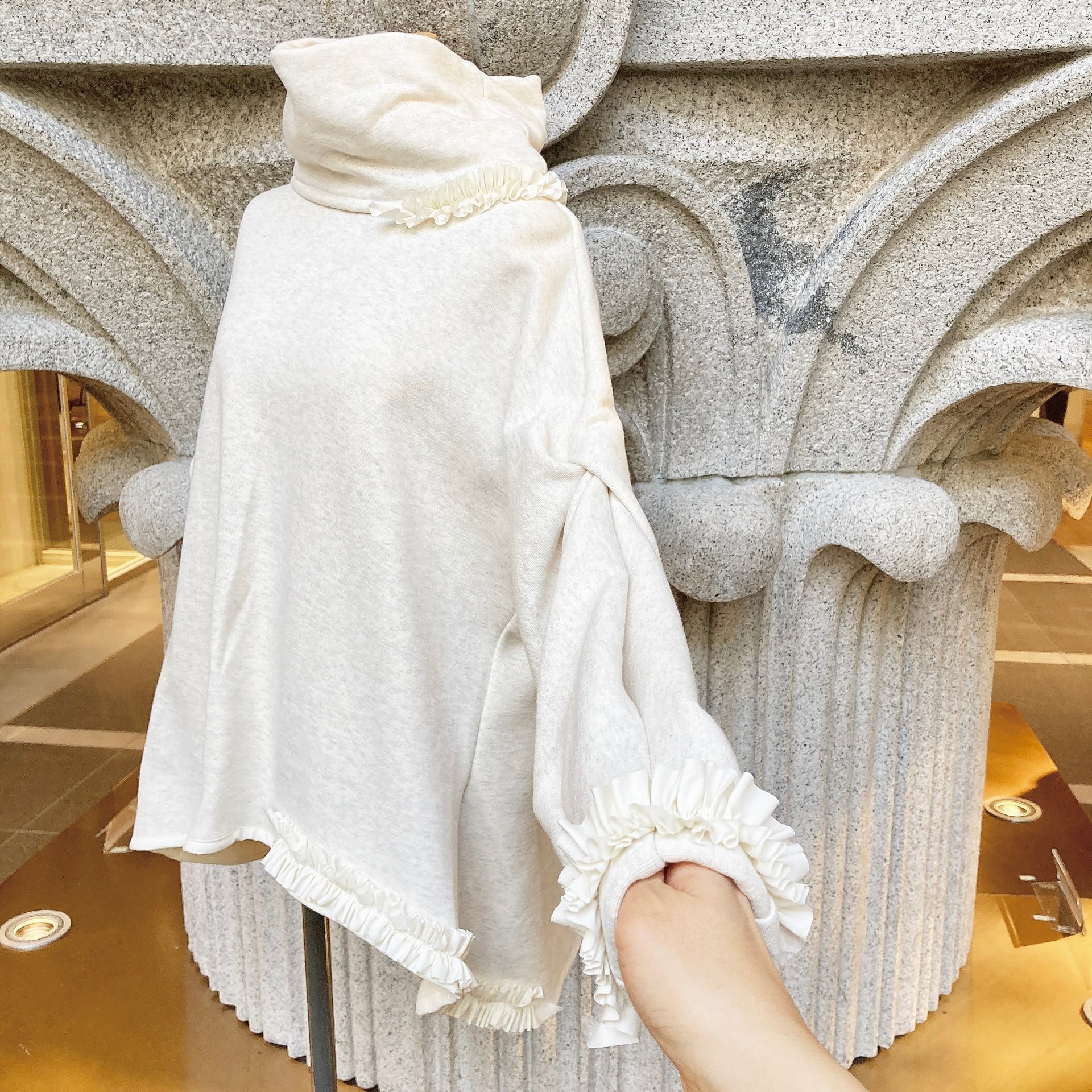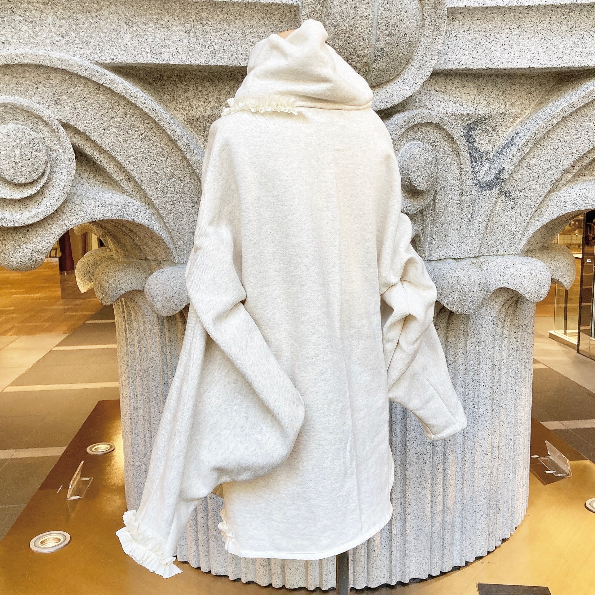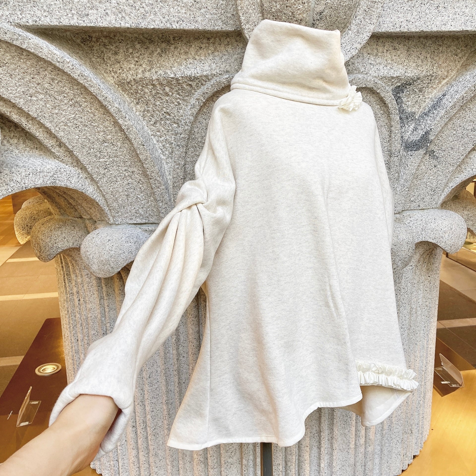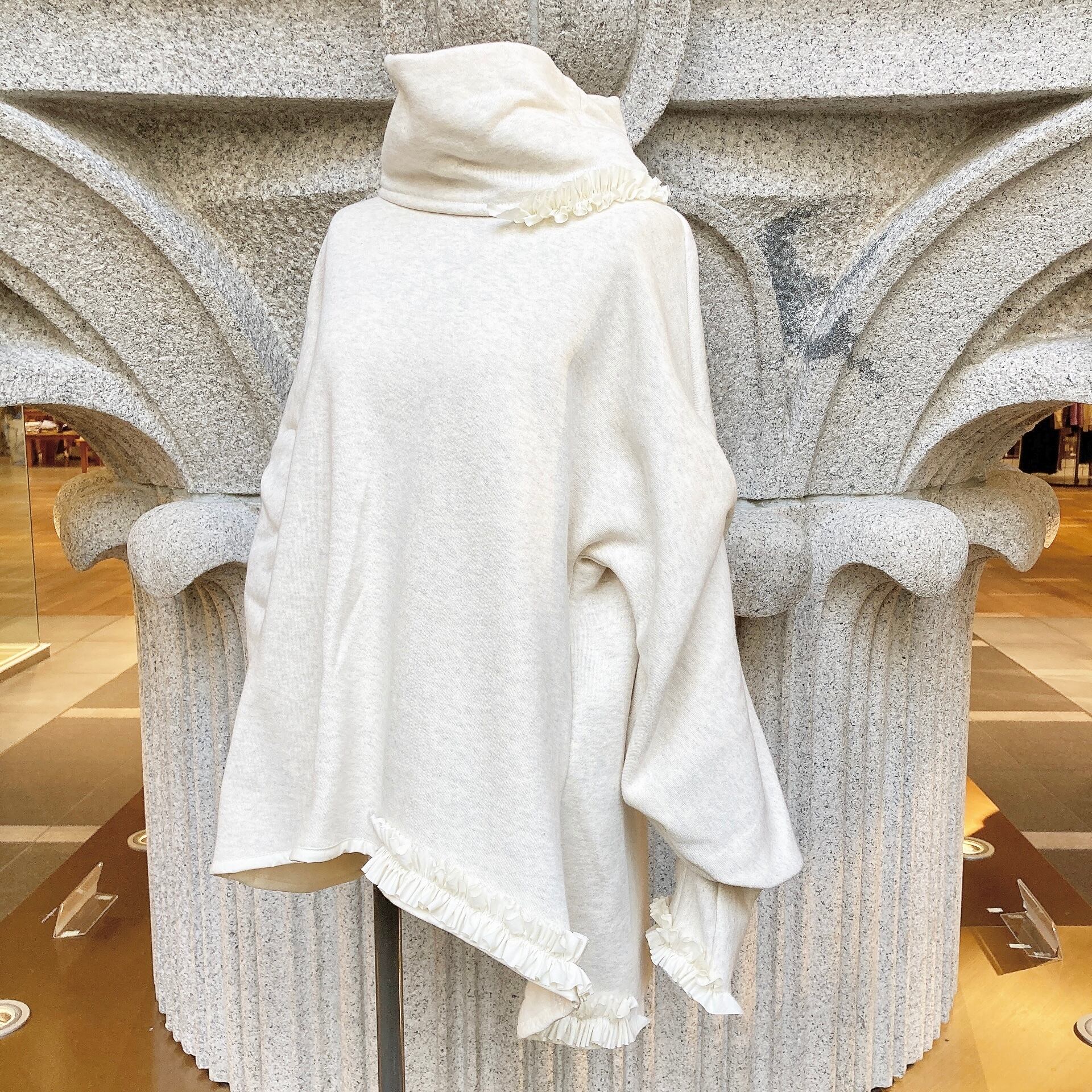 首周りとお袖、どちらもアシンメトリーに施された小さなフリルが、可愛らしさを引き立たせます。