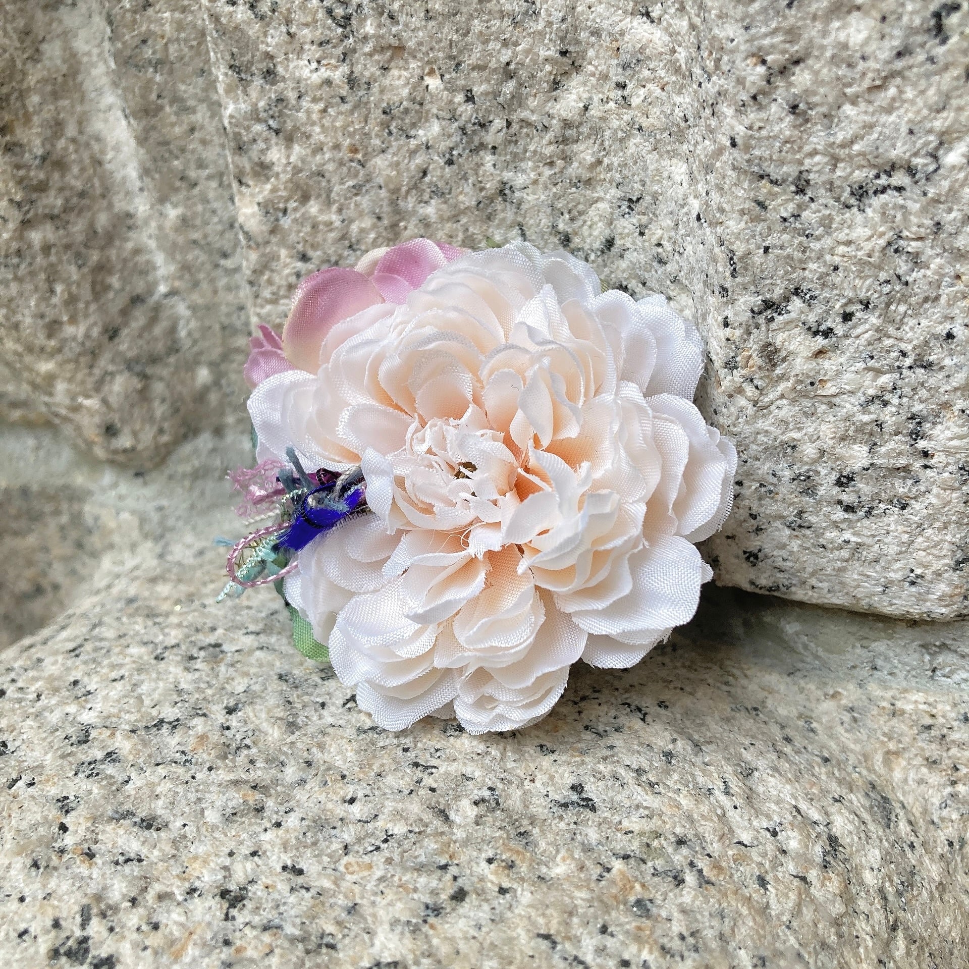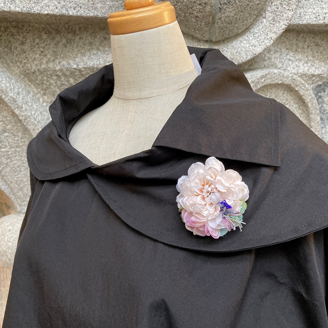 優しく淡いアプリコットピンクのダリアのコサージュ。