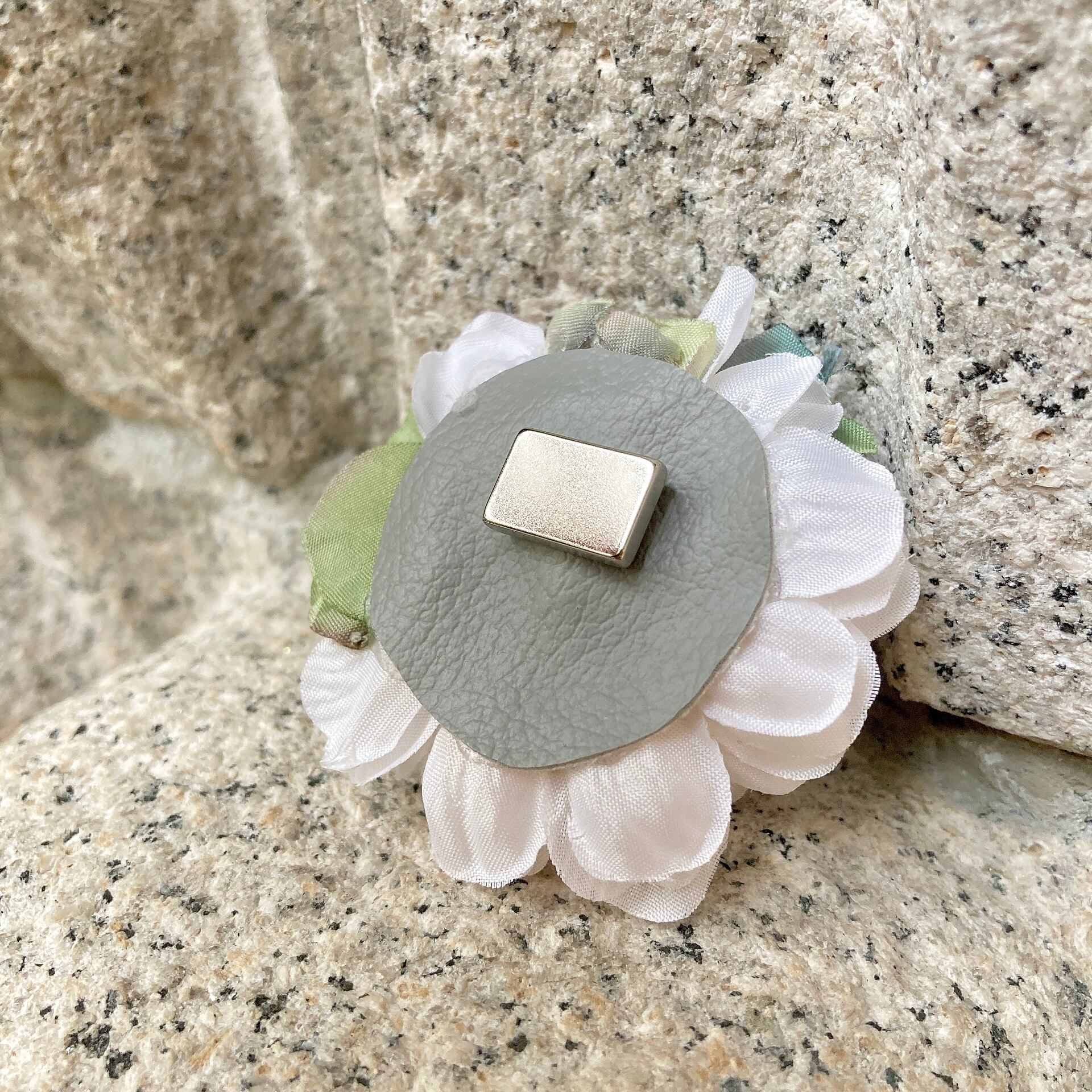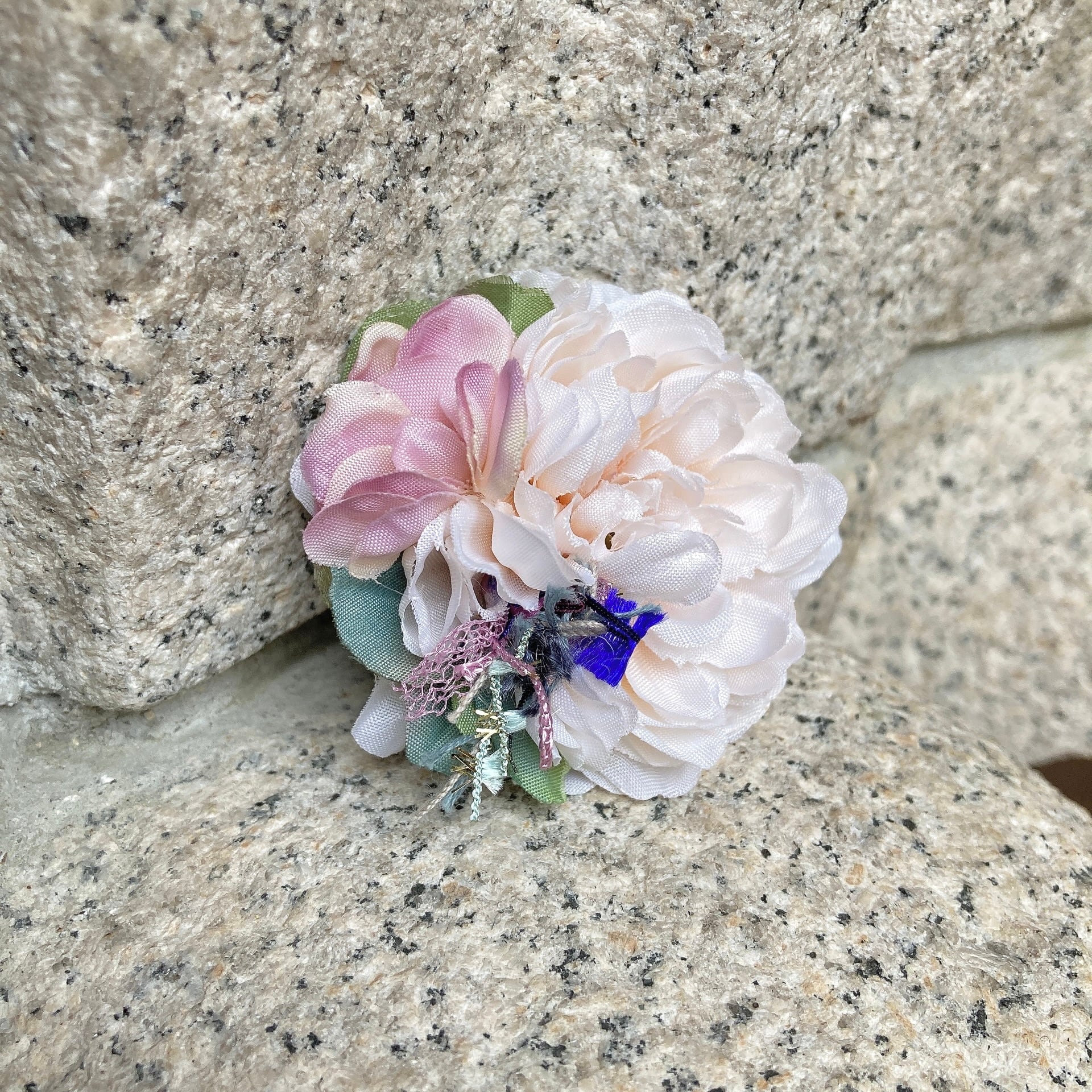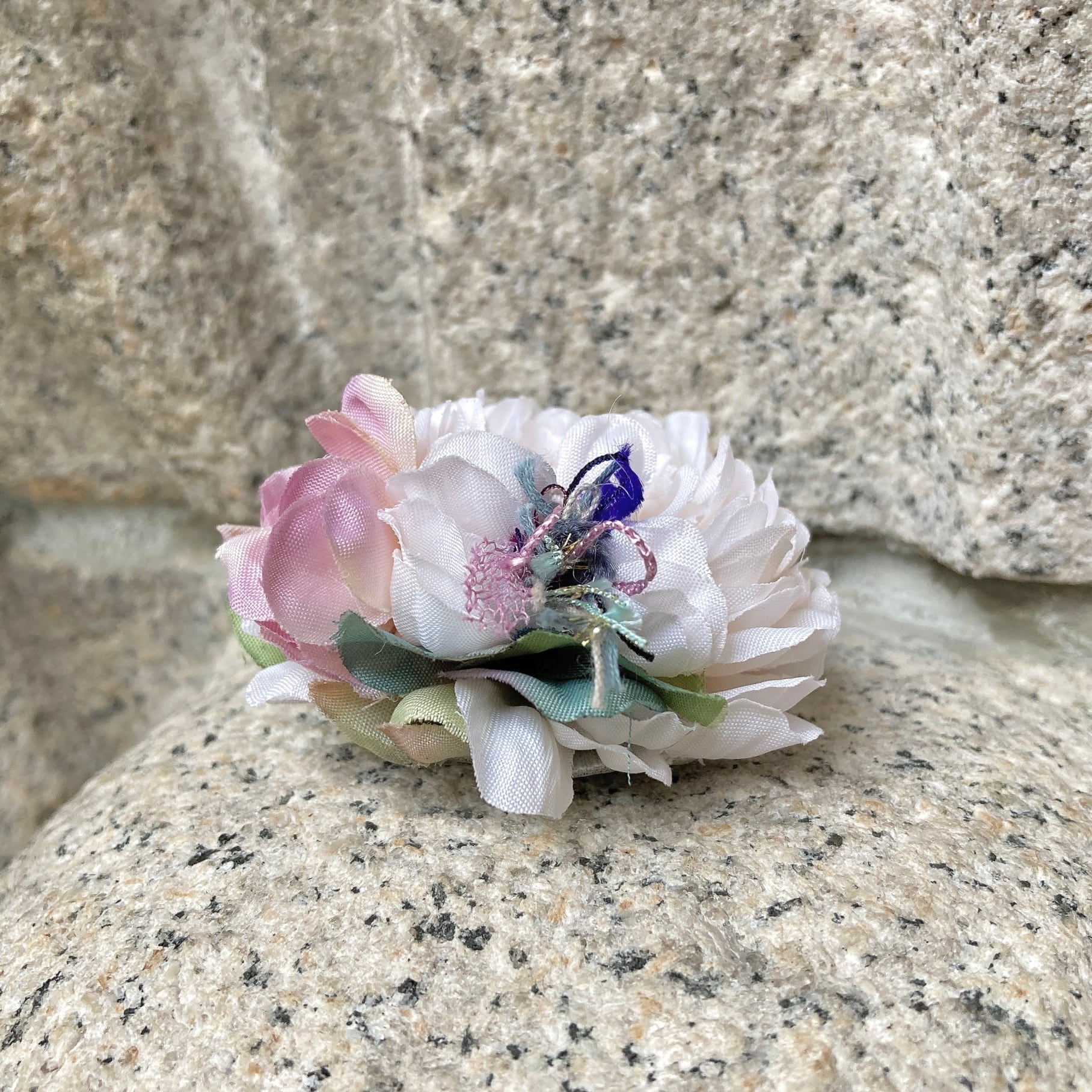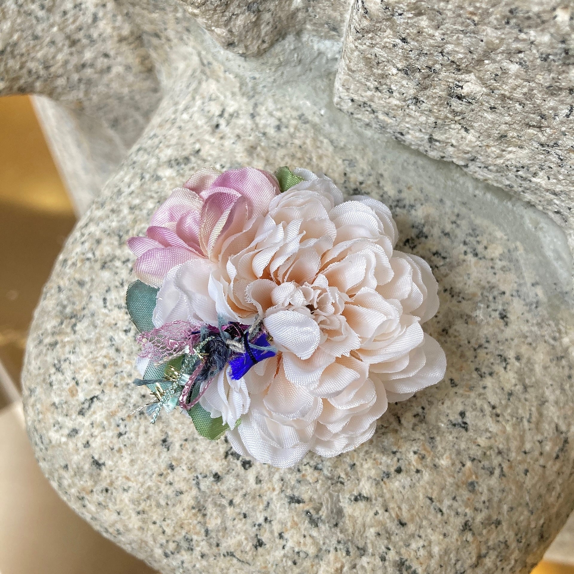 独創的な配色が特徴の大人の花アイテム。手染めのアートフラワーで作るコサージュ、ヘアアクセは全て1点もの。コサージュはマグネットで留めるので安心です。