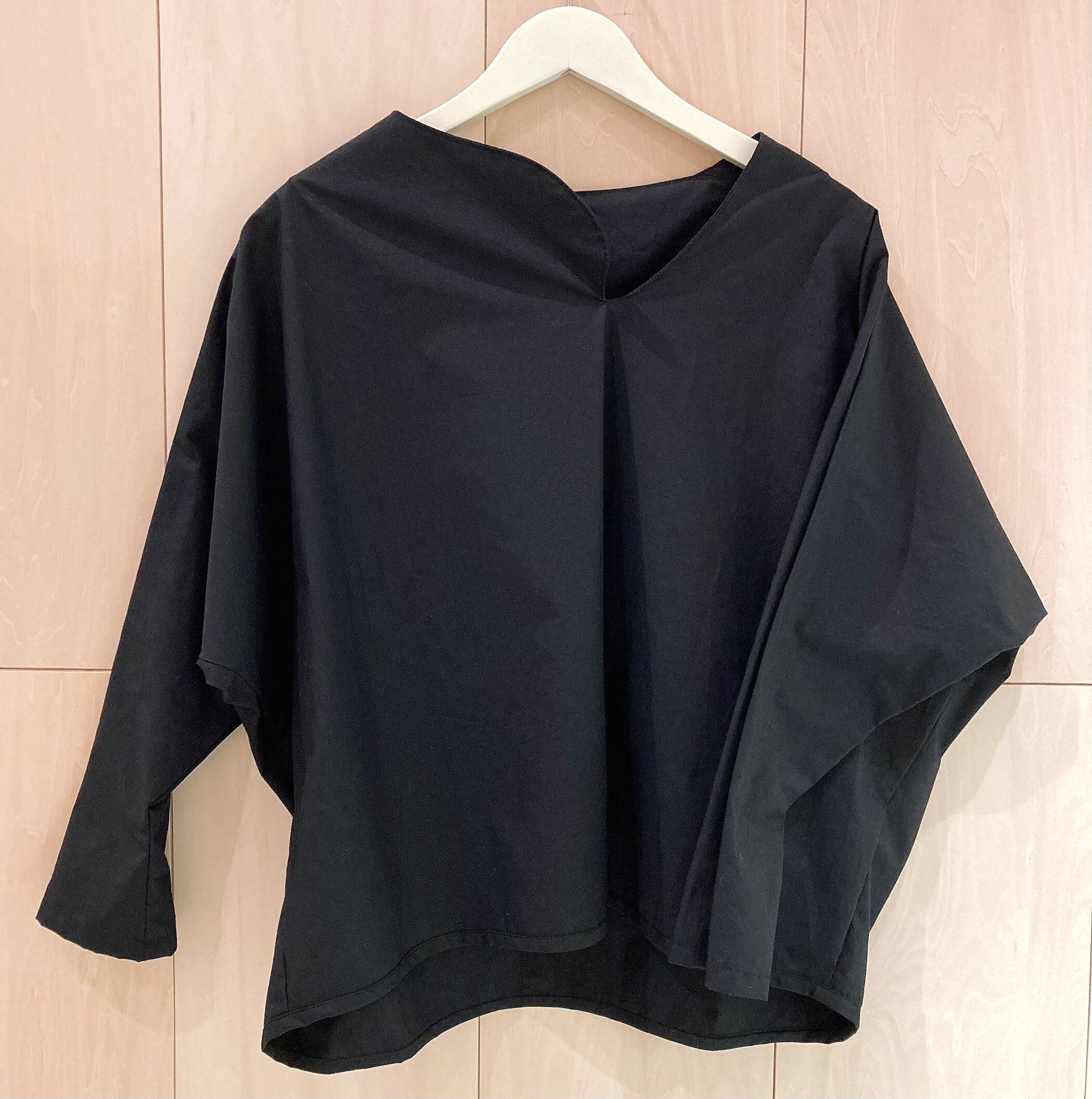 お袖はシンプルですが、お襟のカットが印象的なドルマンブラウス。