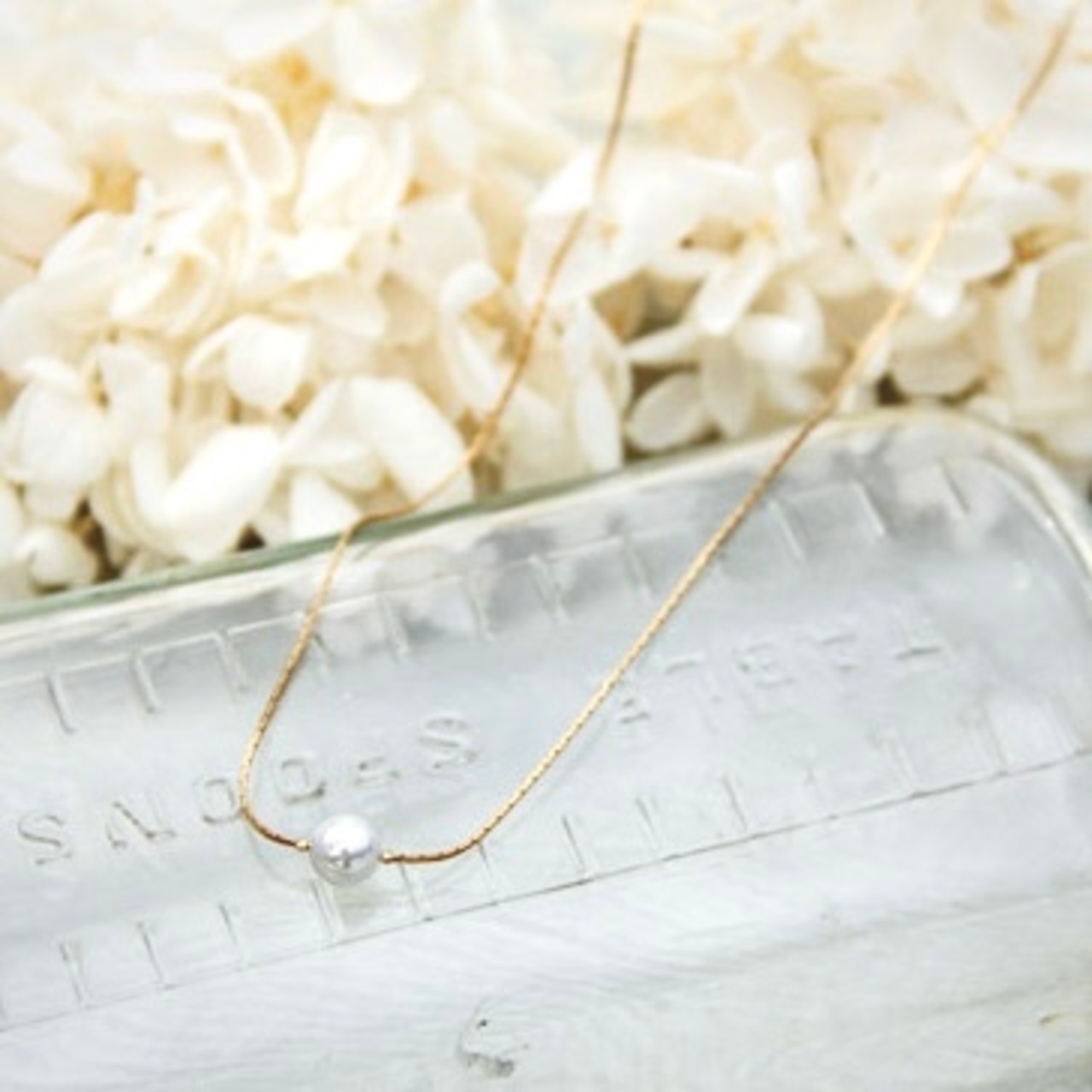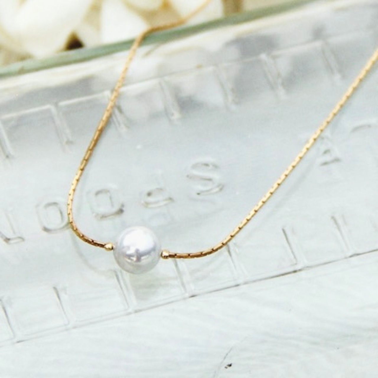 約6mmの丸いシェルパールが一粒ついたシンプルなショートネックレス。