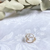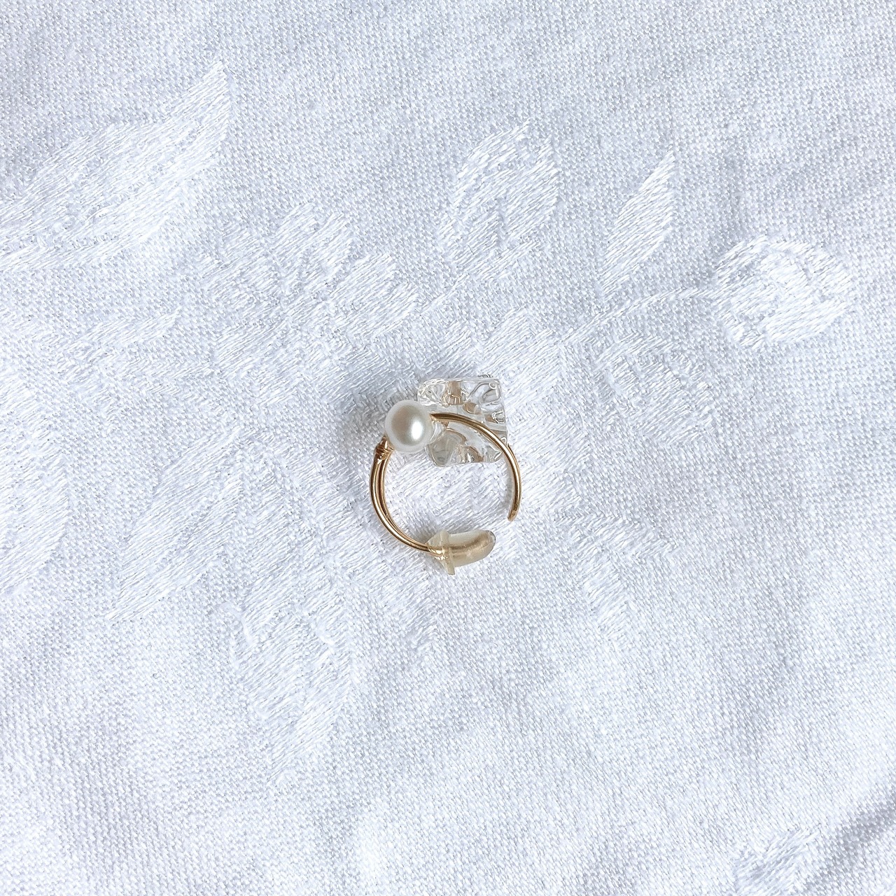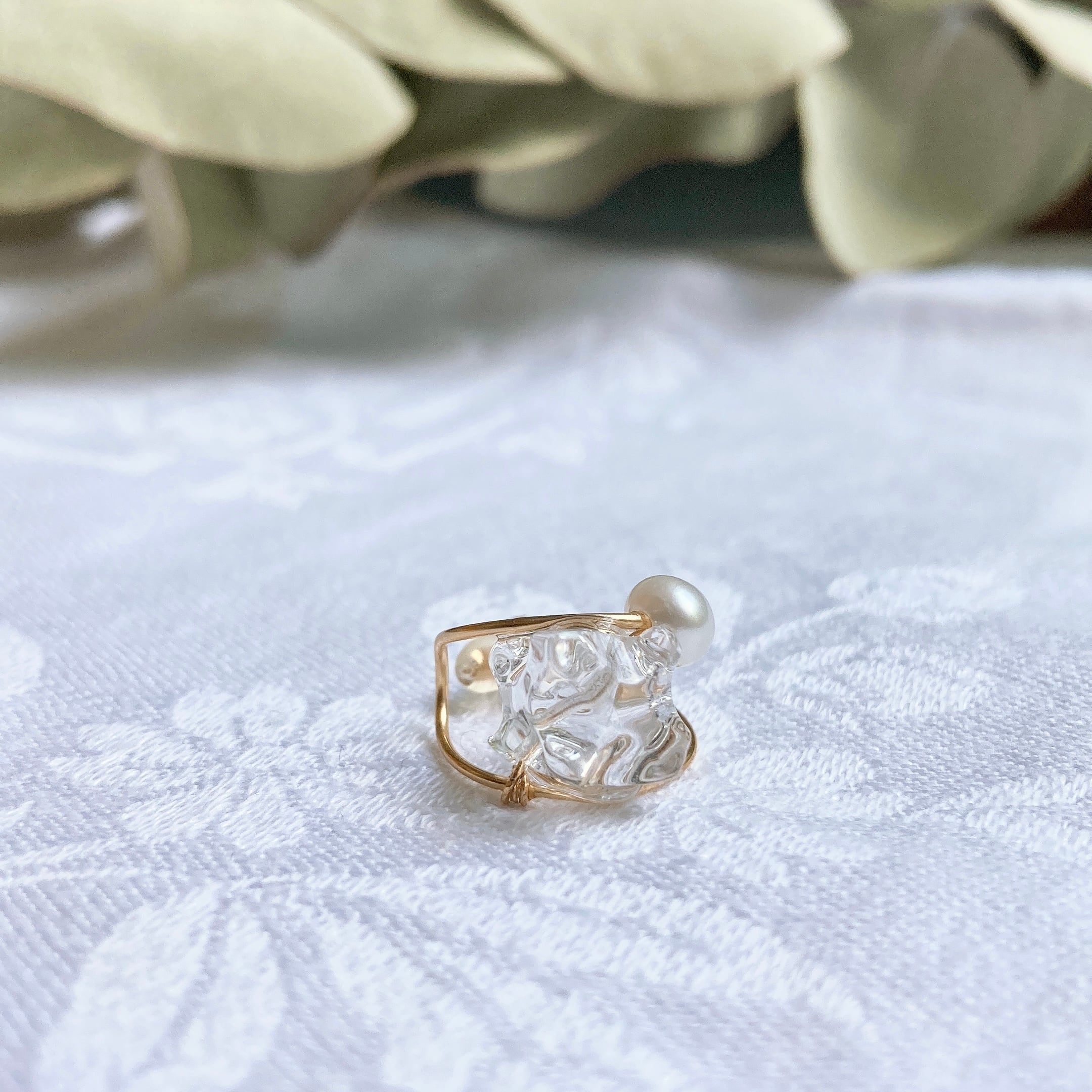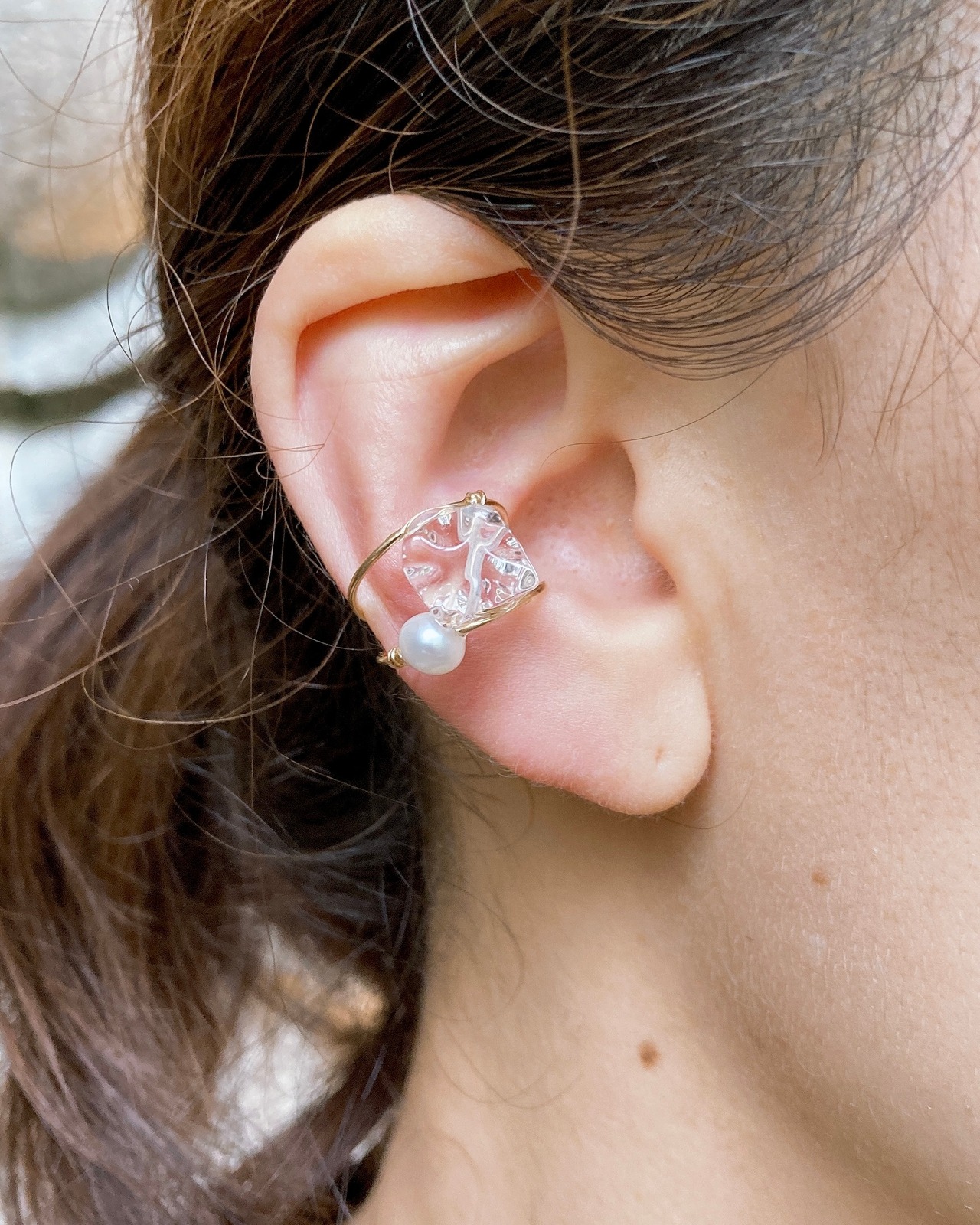 金平糖のようにポコポコした形の水晶と淡水パールを合わせたイヤーカフ。