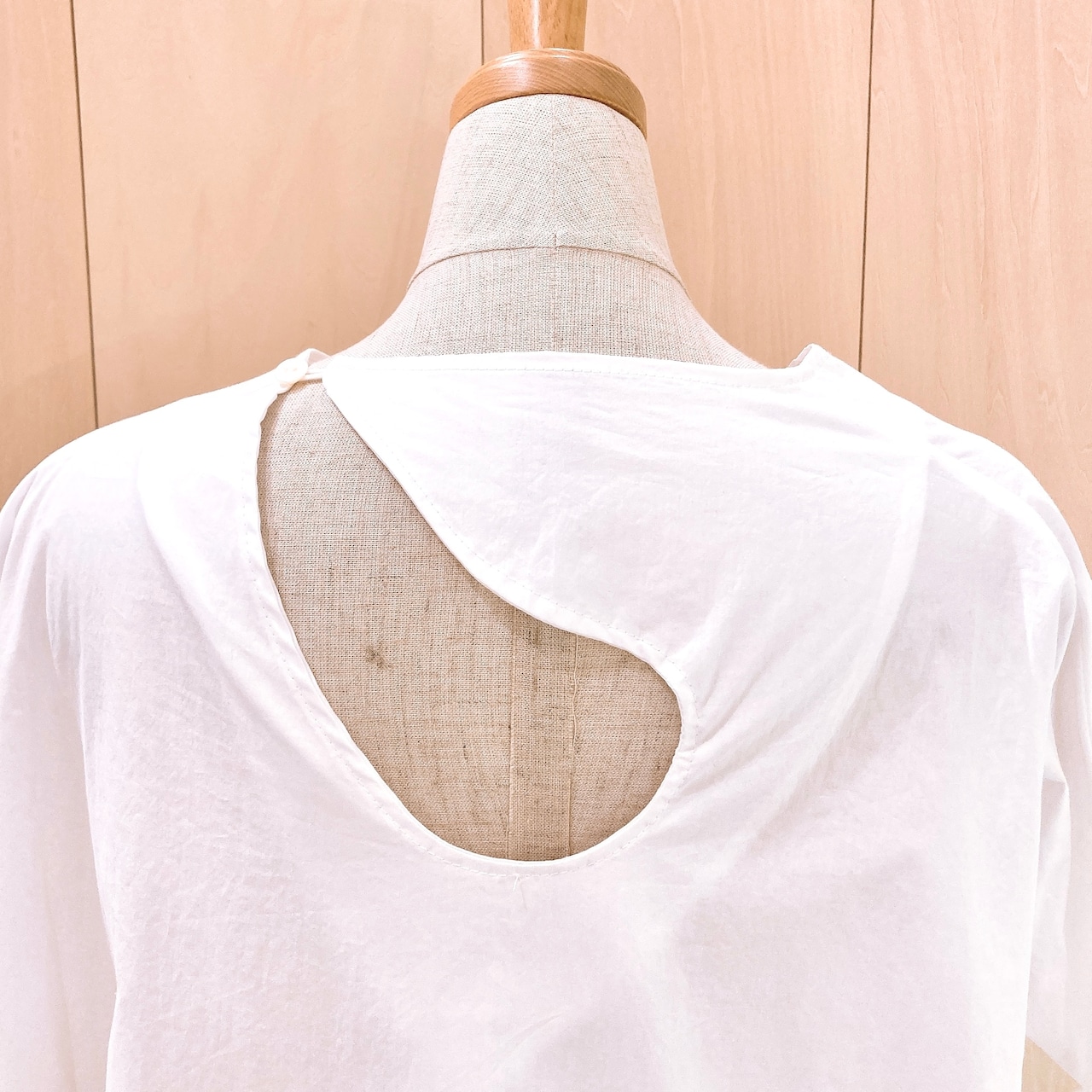 勾玉のような形に大胆に開いたバックスタイルのAラインワンピース。