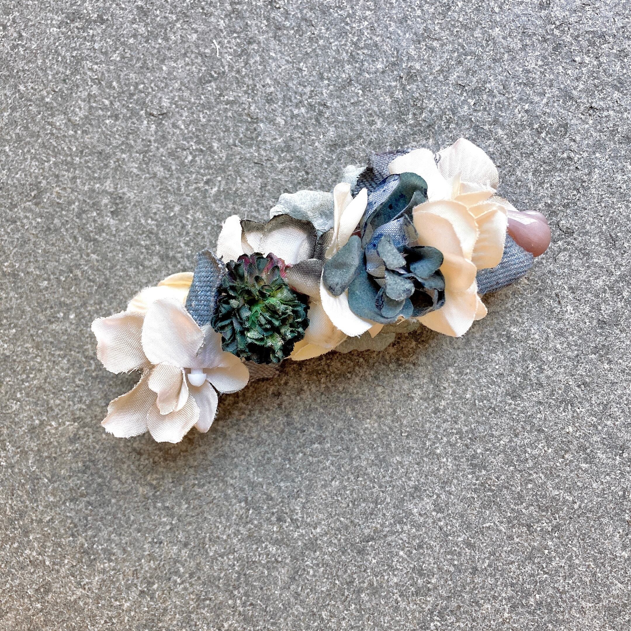 淡い色目のお花とパープルに染めたデニム地を組み合わせたバナナクリップ。