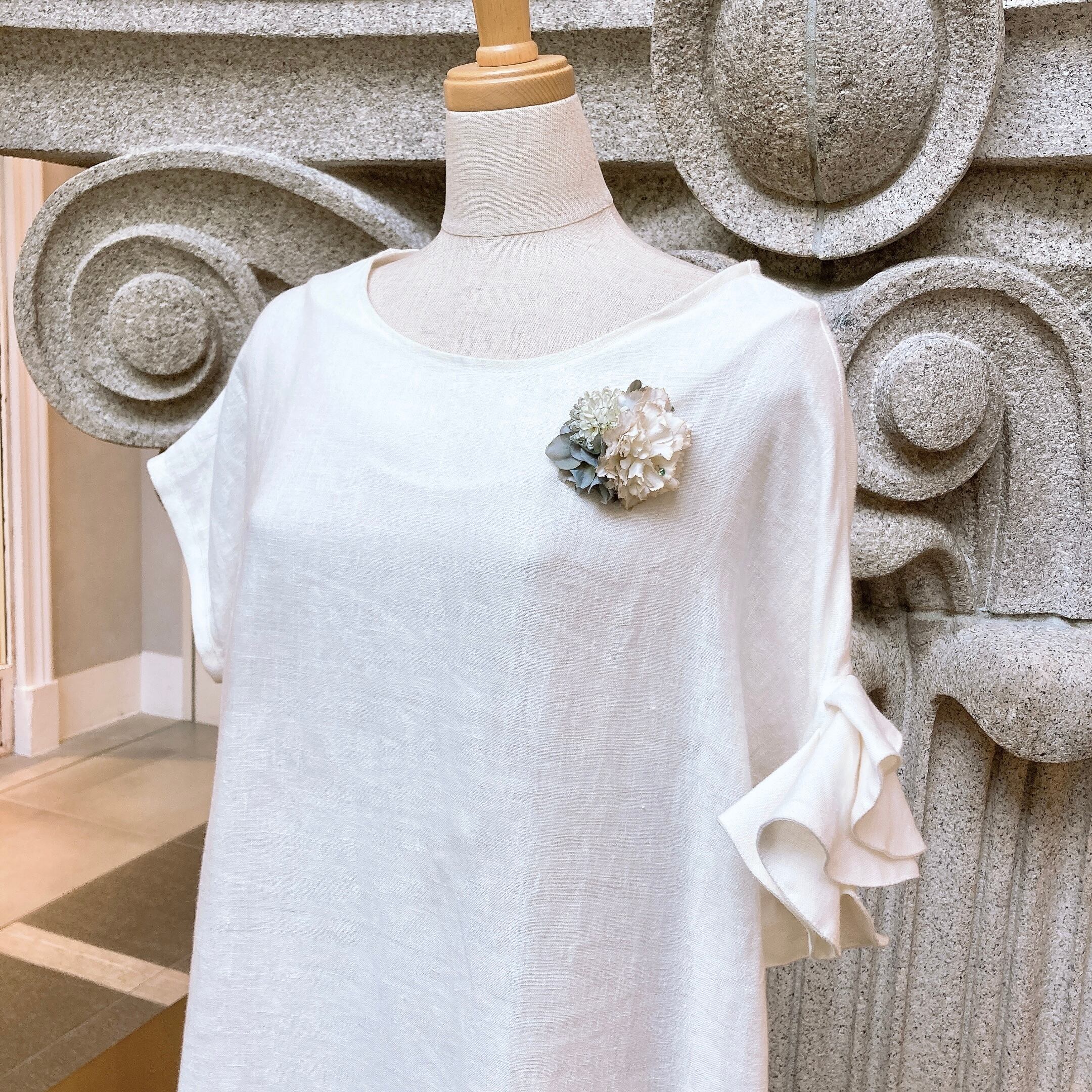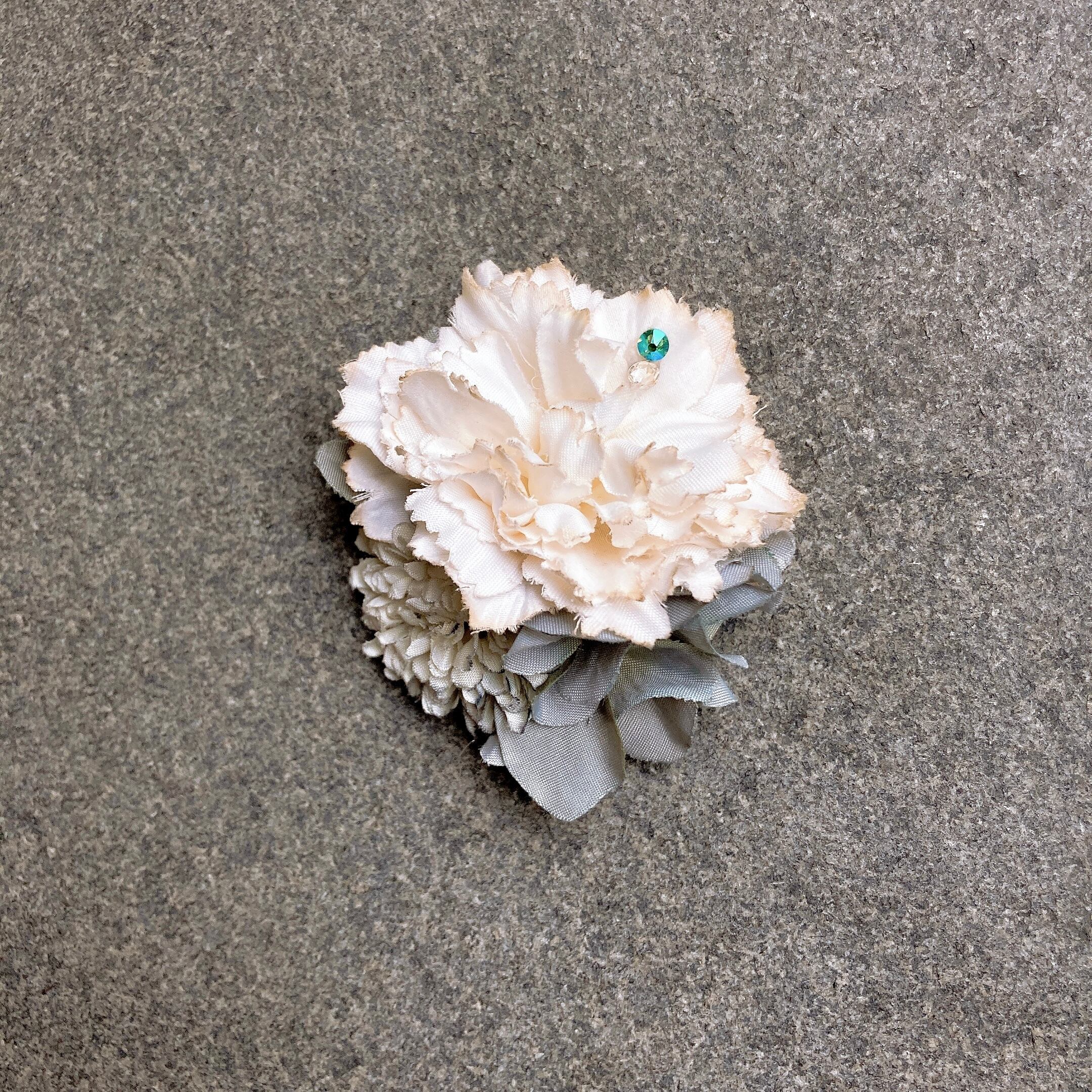 白のカーネーションとグレーがかったお花で作ったコサージュ。