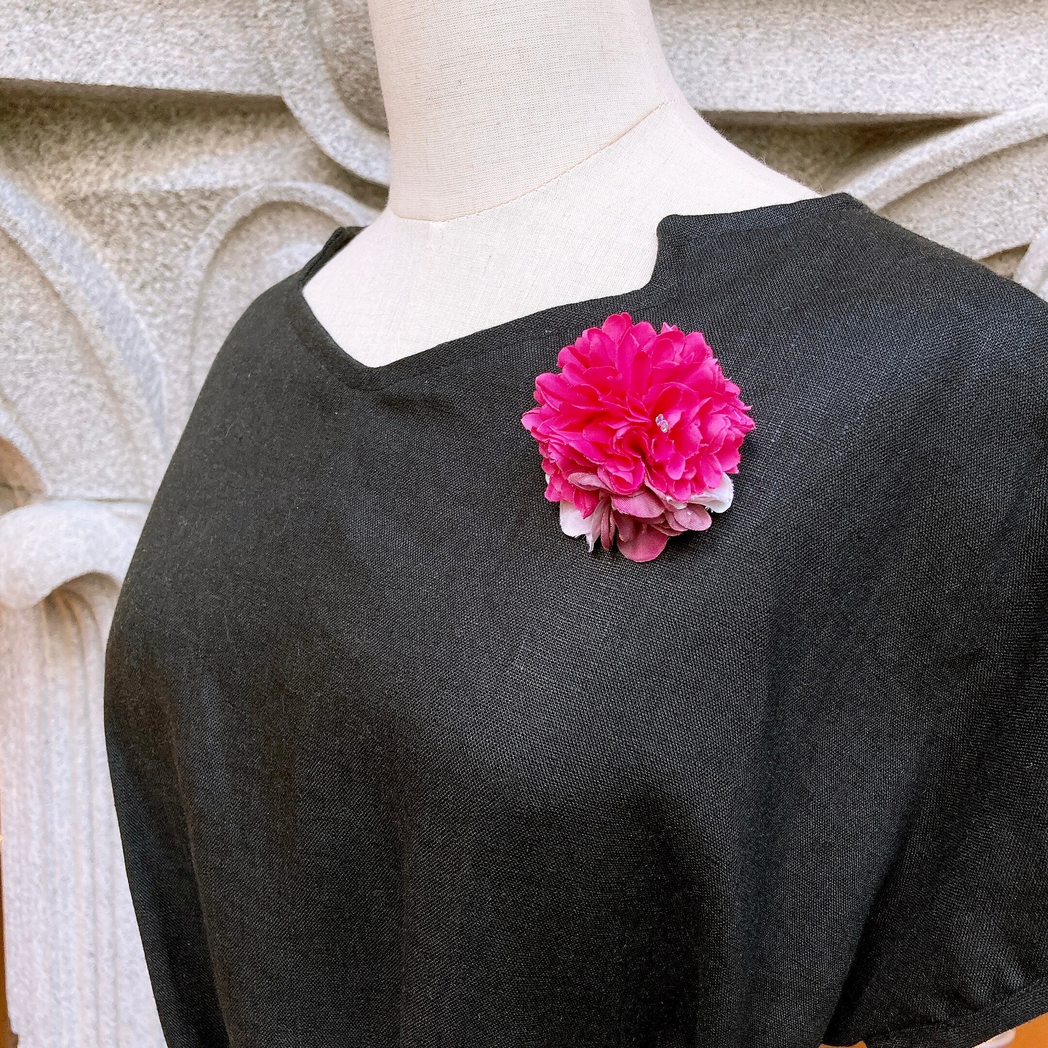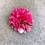 目が覚めるような鮮やかなピンクのコサージュ。別売りのクリップを使うと髪に飾ることもできます。