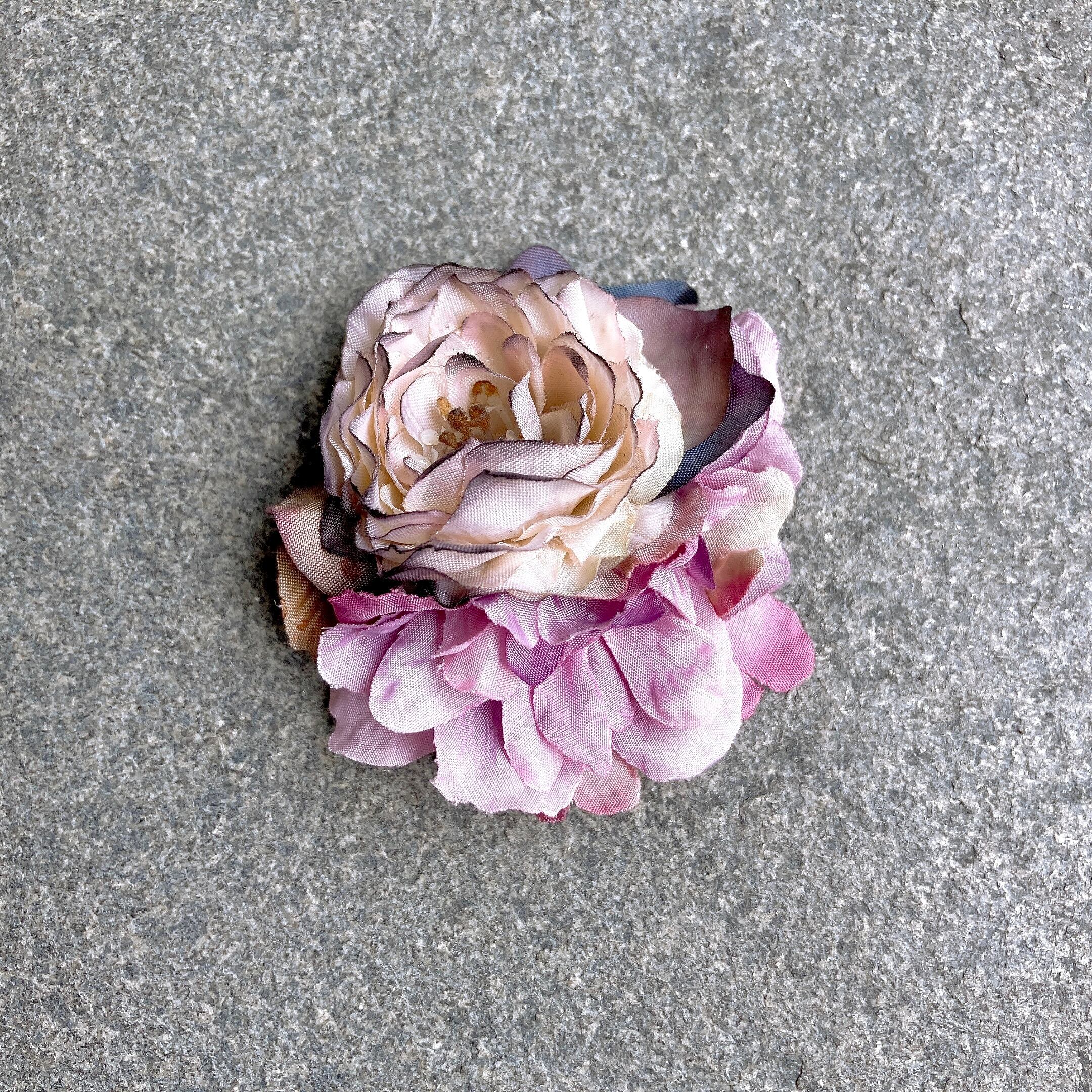 手染めのアートフラワーで作るコサージュ、ヘアアクセは全て1点もの。