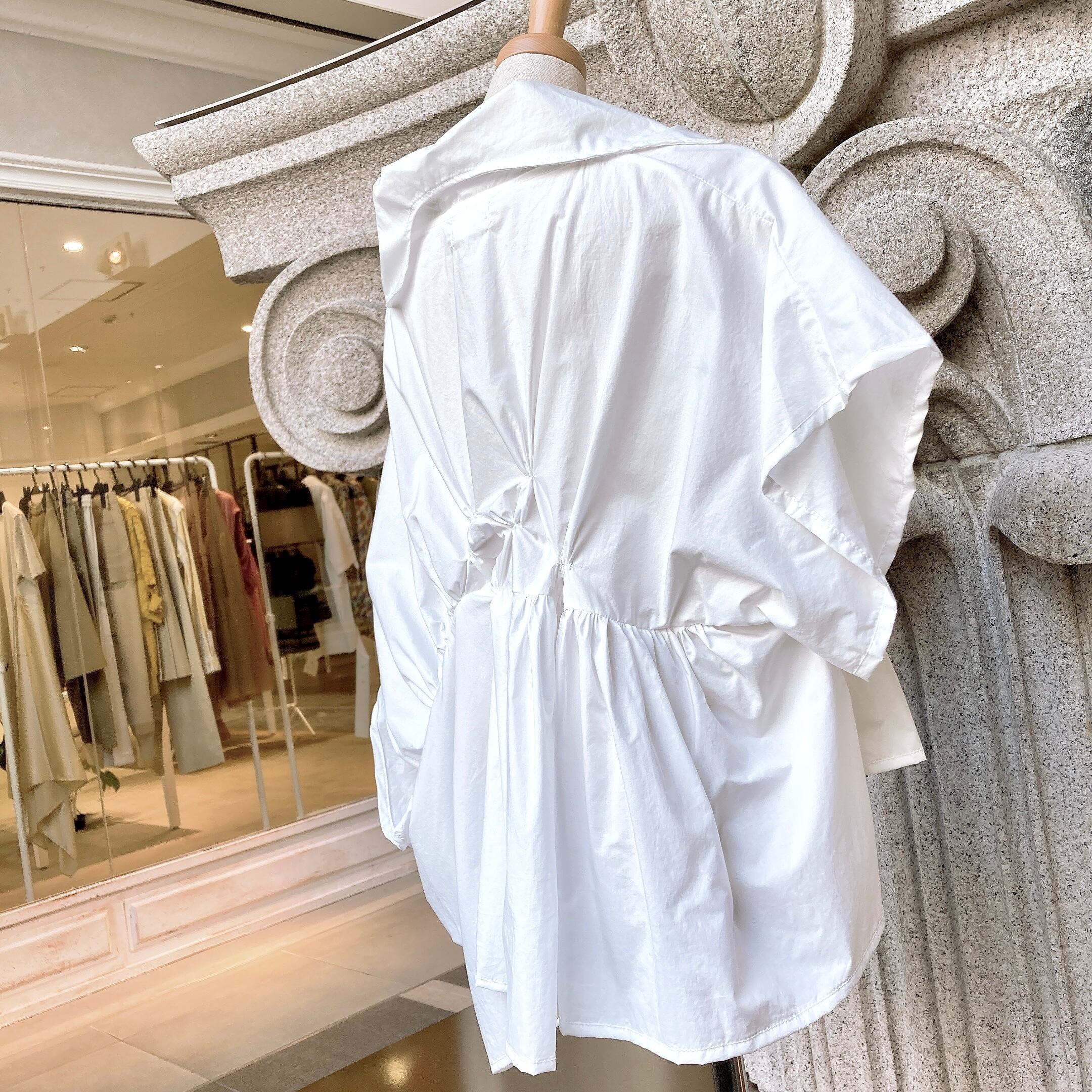 前から後ろに繋がったタックが特徴的なデザインブラウス。