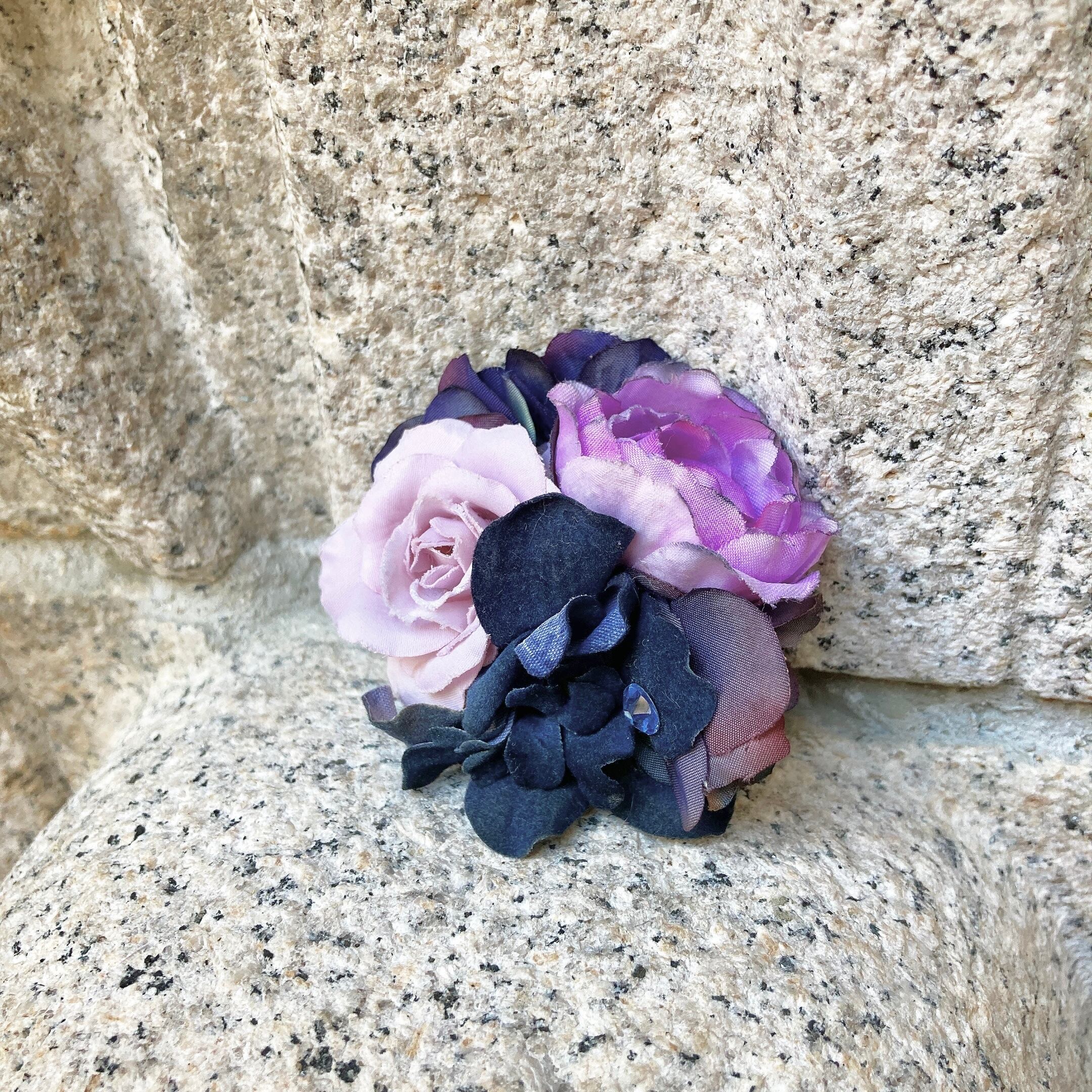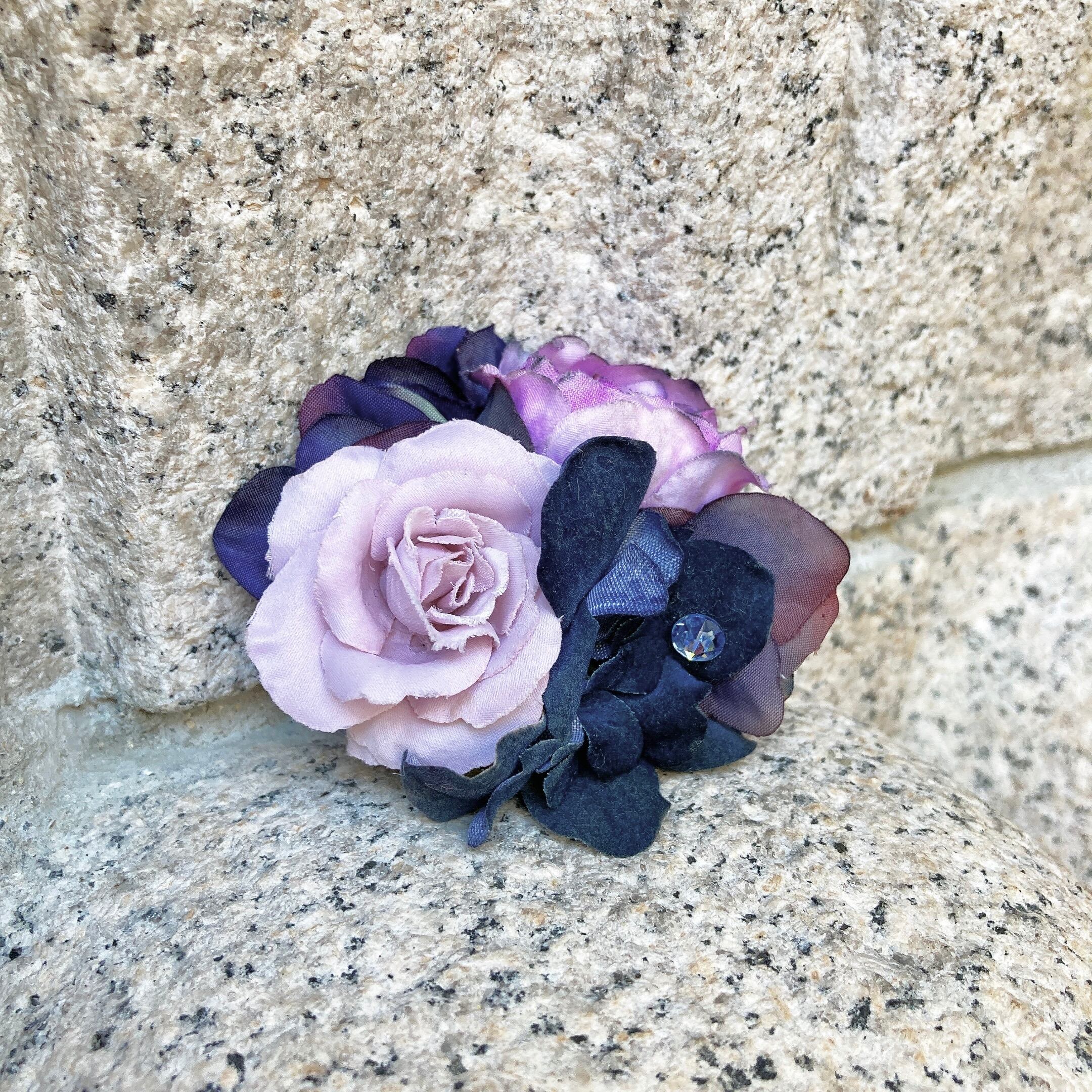 ピンクの濃淡と黒っぽいグレー、ネイビーも合わせたミックスカラーのコサージュ。
