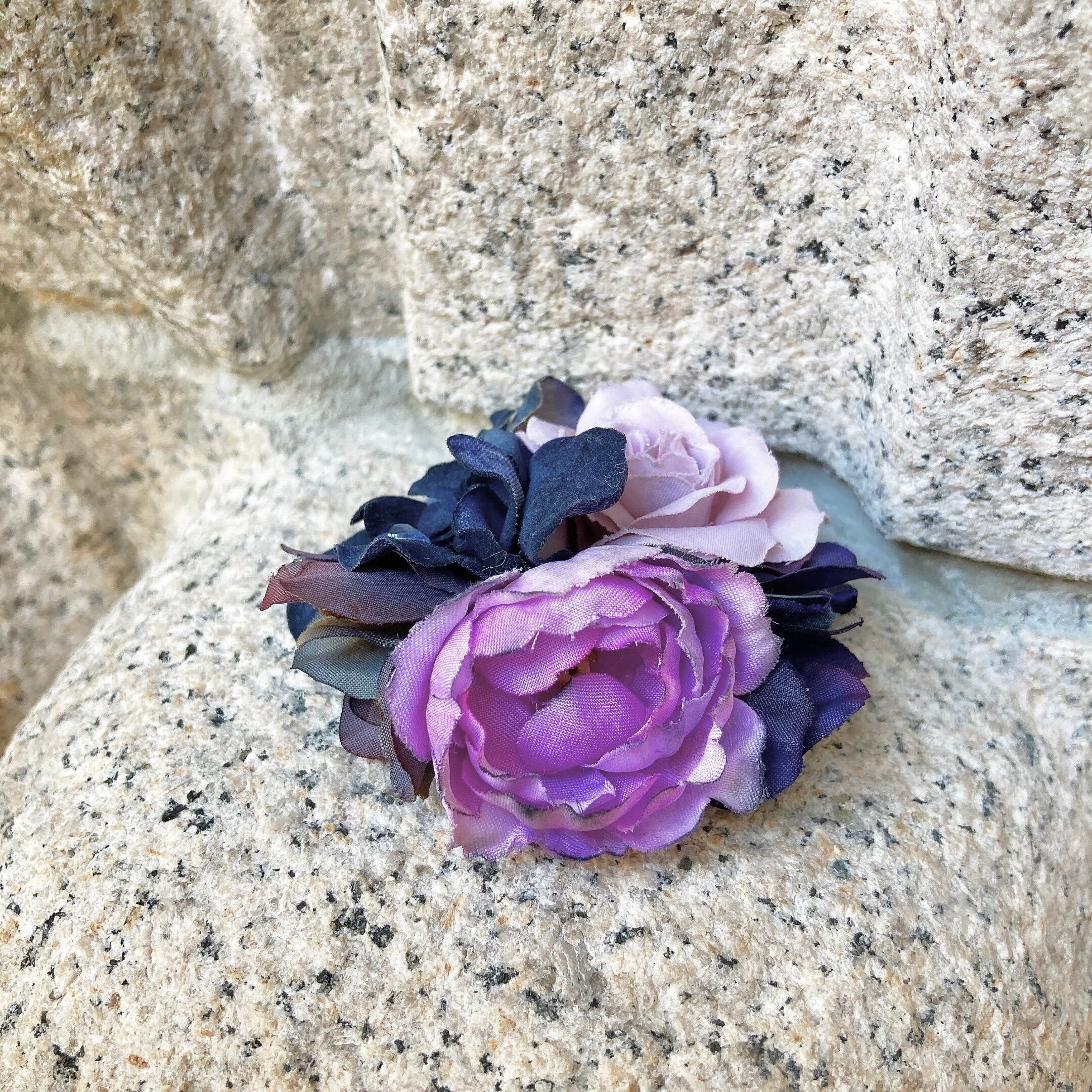手染めのアートフラワーで作るコサージュ、ヘアアクセは全て1点もの。