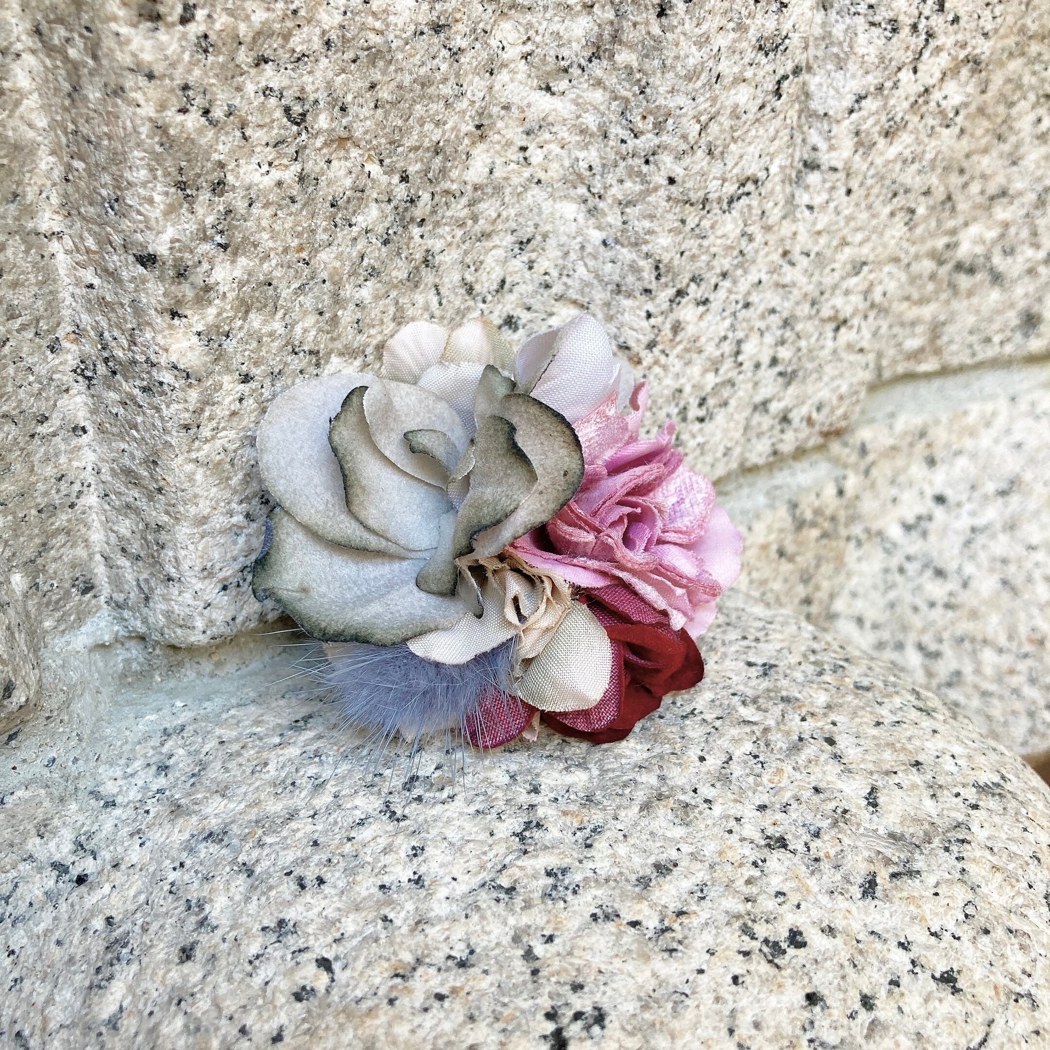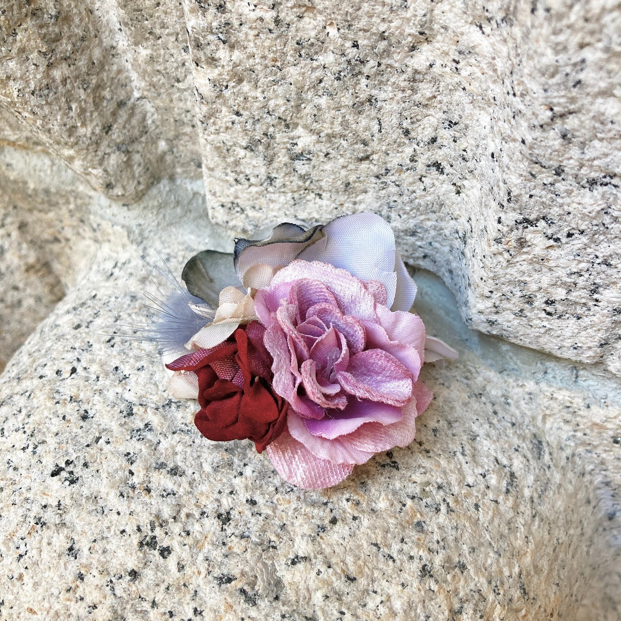 手染めのアートフラワーで作るコサージュ、ヘアアクセは全て1点もの。