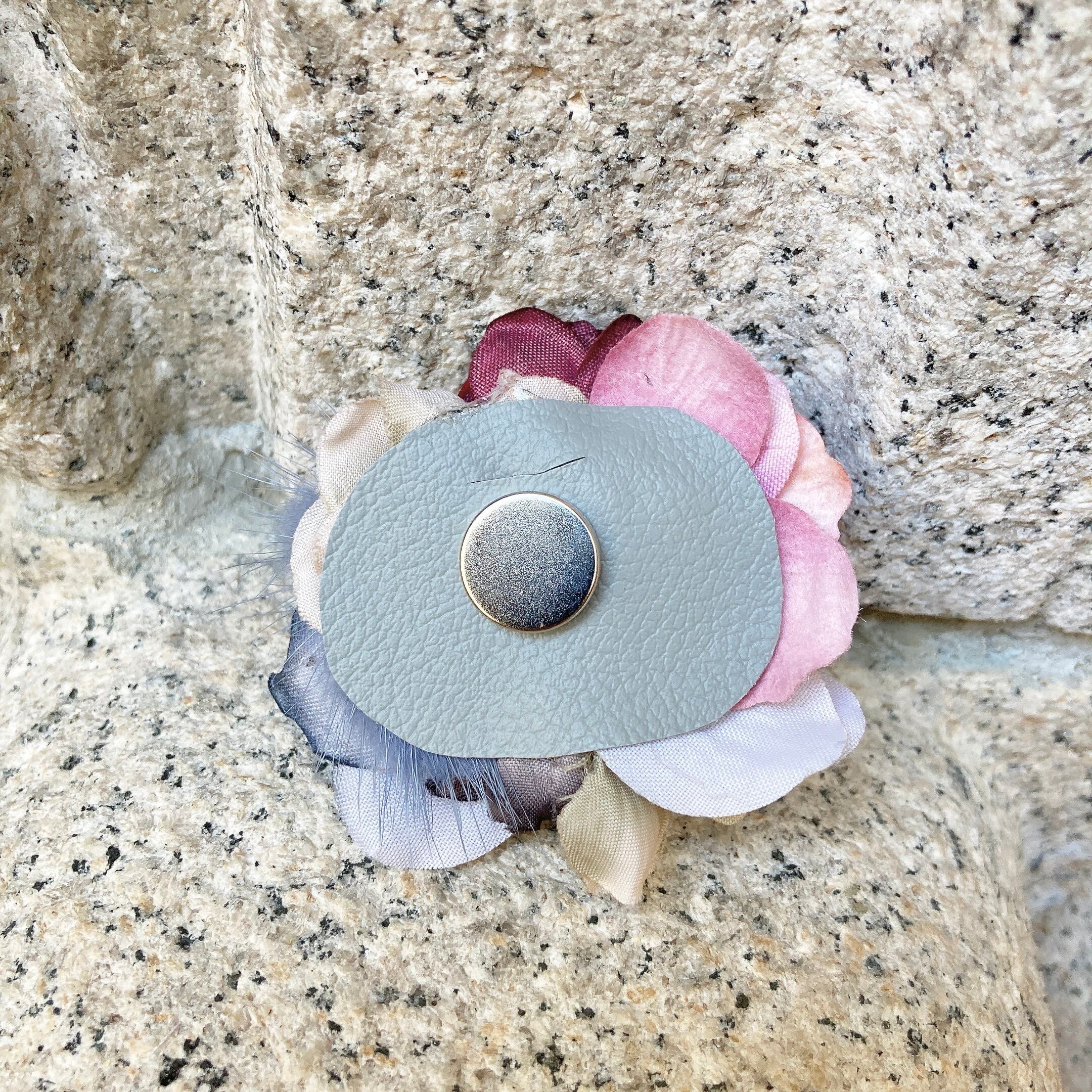 華やかなピンクと大人っぽいグレーを合わせたコサージュ。