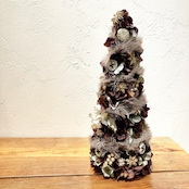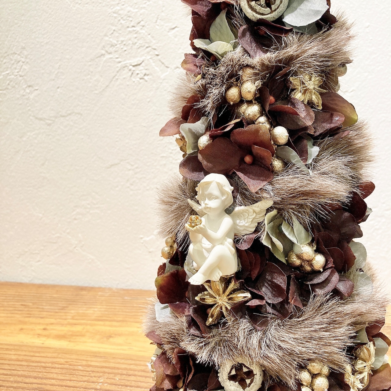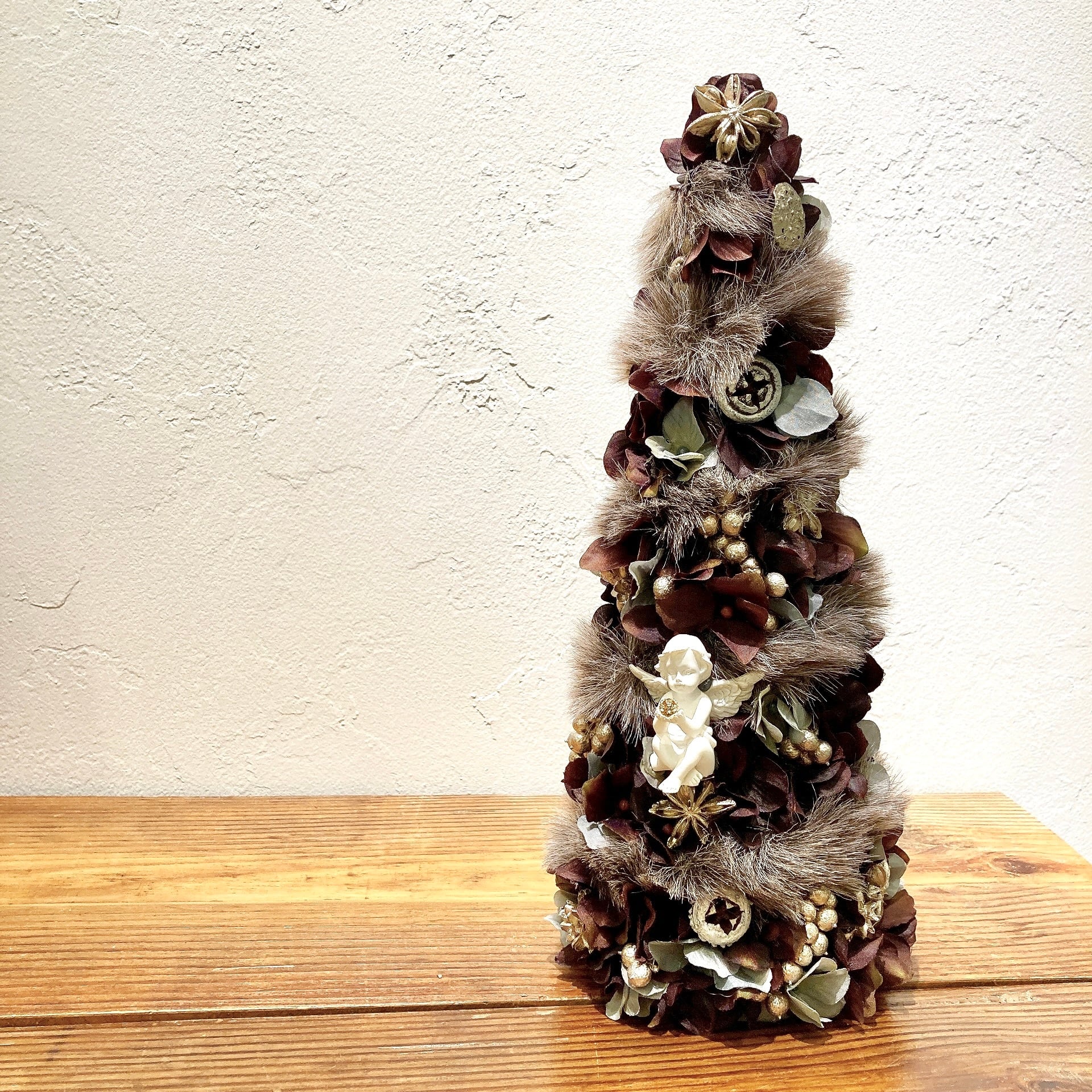 ダークブラウンのお花とベージュのファーリボンで仕上げたエレガントなツリー。
