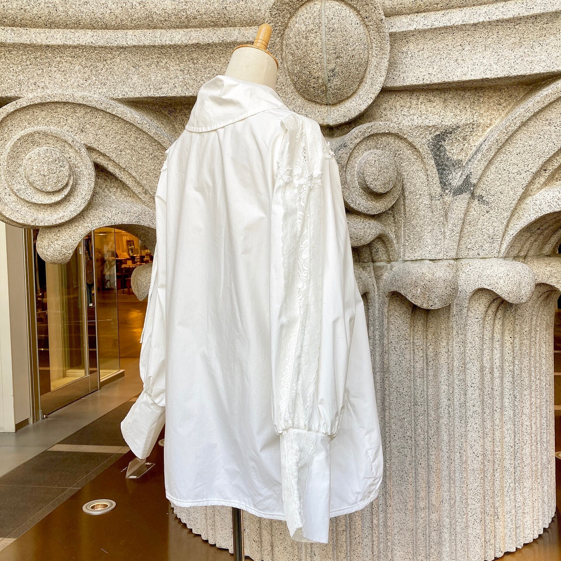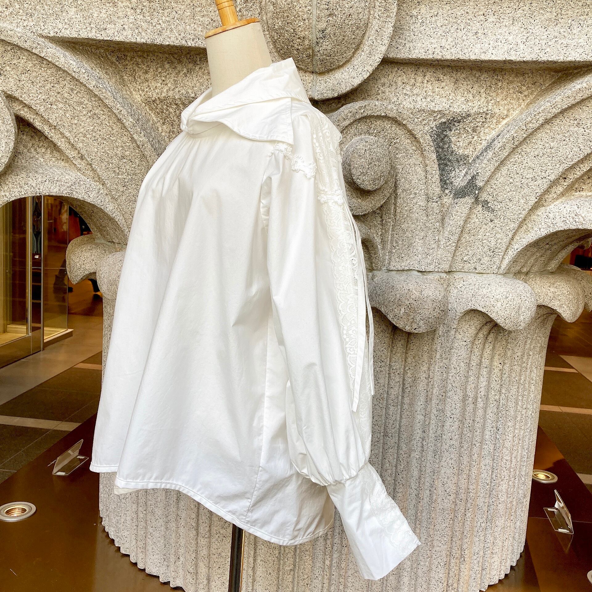 肩から繊細なレース使いが華やかでエレガントなデザインのブラウス。