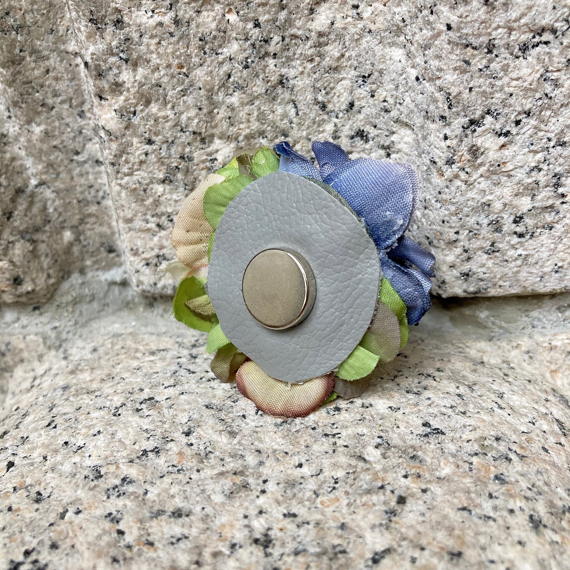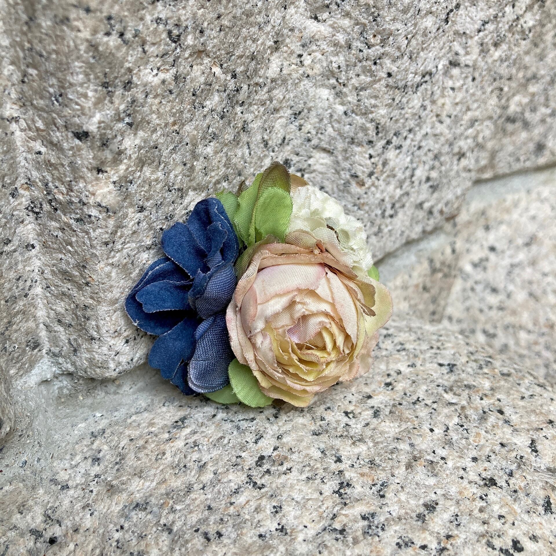 独創的な配色が特徴の大人の花アイテム。手染めのアートフラワーで作るコサージュ、ヘアアクセは全て1点もの。コサージュはマグネットで留めるので安心です。